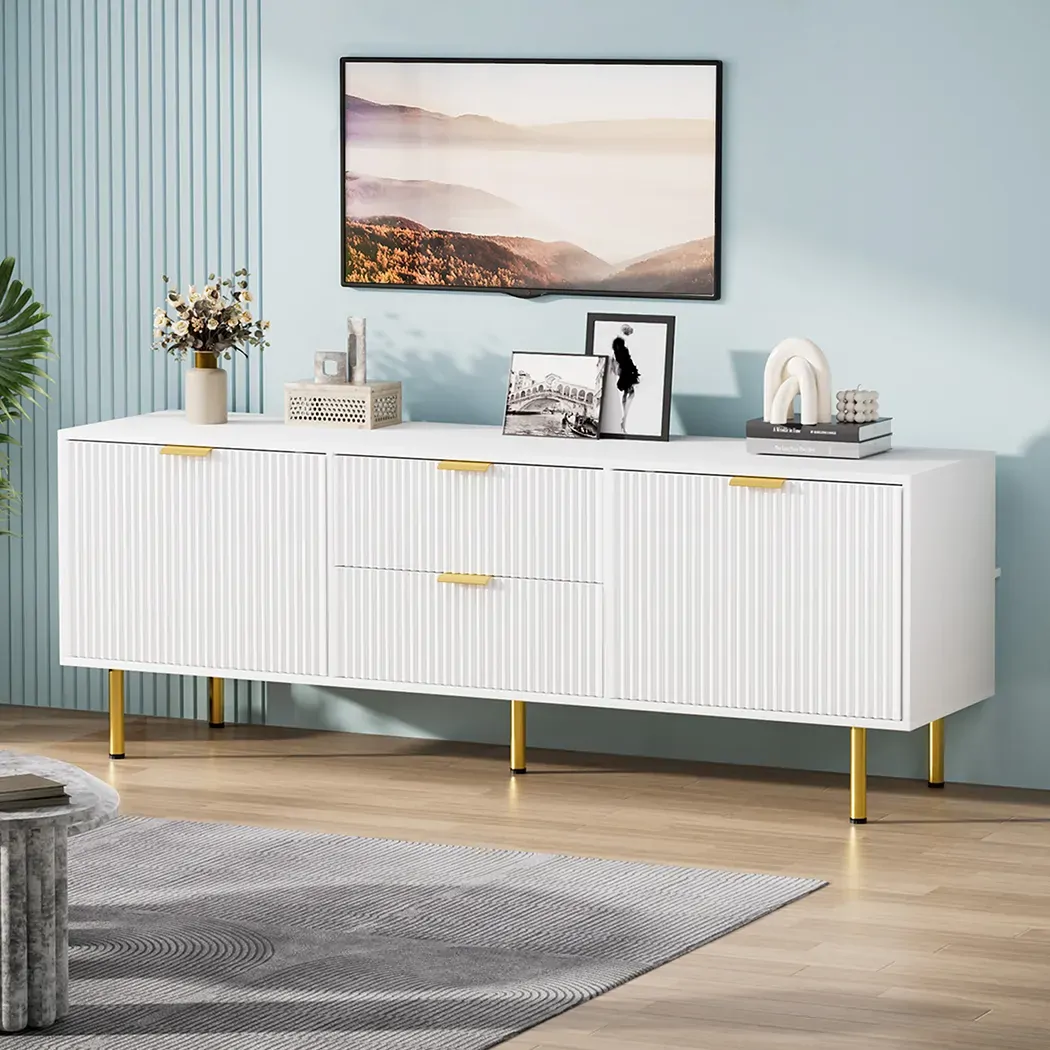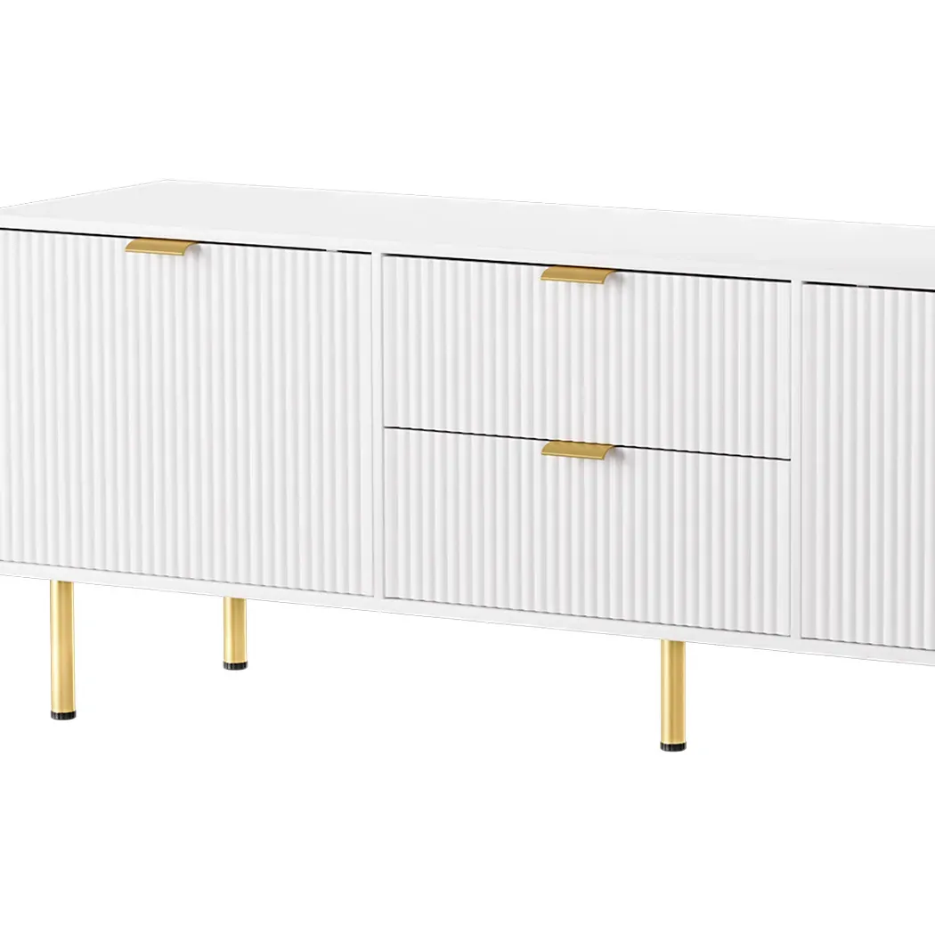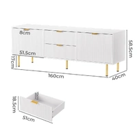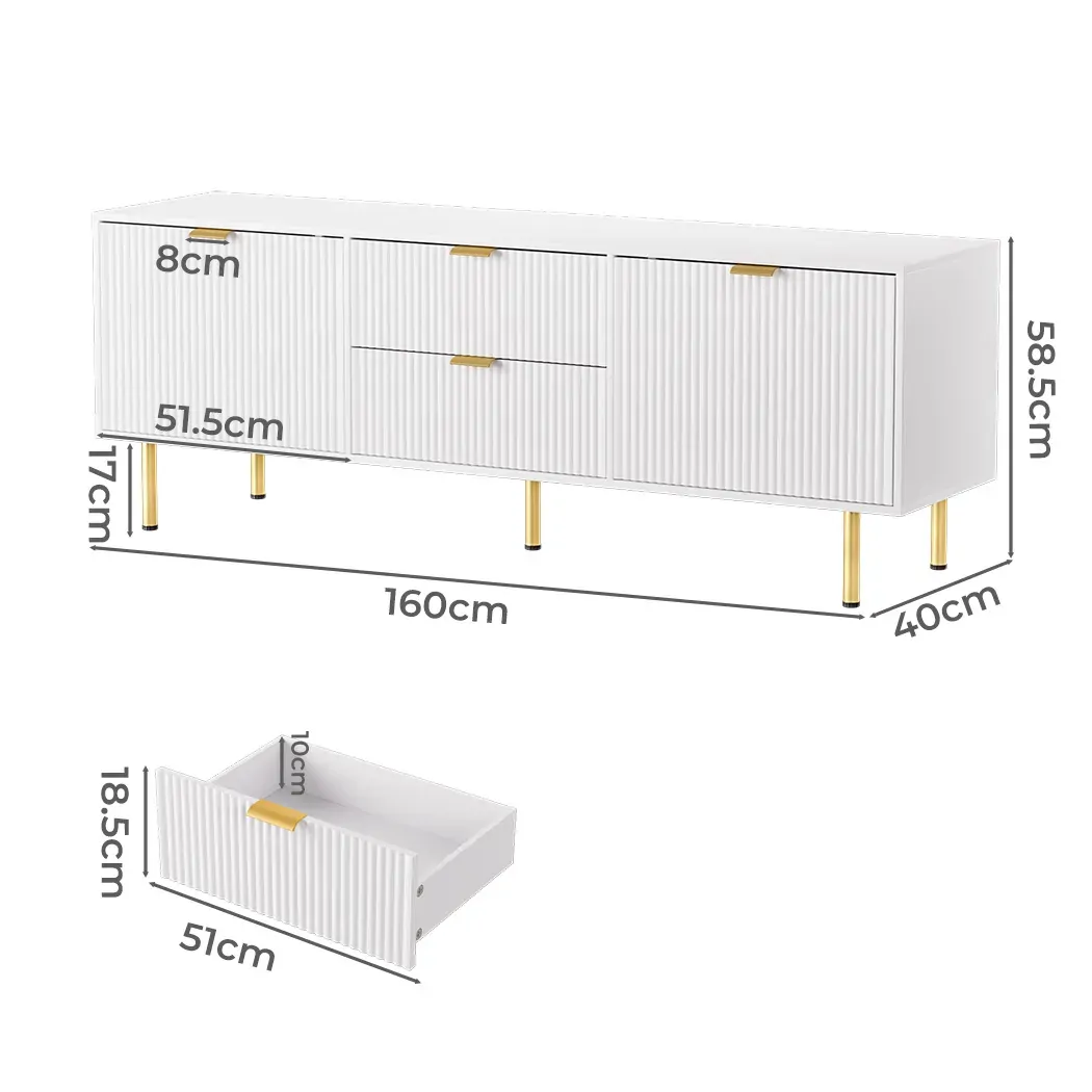 This light-luxury TV stand offers an exquisite design that merges elegance with functionality, making it a refined addition to any modern living space. The cabinet features a distinctive door panel design that adds a touch of sophistication, while its versatile functionality allows it to serve as both a sideboard and a TV cabinet, making it an ideal multipurpose piece. Storage is a key focus, with fully enclosed doors that protect stored items from dust, providing ample space with extra-wide and deep compartments. Constructed from high-quality 15mm veneer MDF, the cabinet is designed for durability and everyday use. The sturdy iron legs enhance both the visual appeal and stability of the piece, ensuring it stands the test of time. Measuring 1604058 cm, this cabinet fits well in various room sizes without overwhelming the space, offering a compact yet functional design.