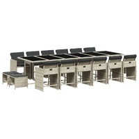 This garden dining set is a great choice for al fresco dining or just relaxing in the garden, backyard, or on the patio. Durable material: PE rattan, also known as poly rattan, is a strong, low-maintenance synthetic material that looks like natural rattan. It's lightweight, easy to clean, and commonly used for outdoor furniture due to its durability and weather-resistant properties.Compact storage: These chairs have a flap backrest that can be folded down, making it easy to store them under the table. When folded, they neatly fit under the table, forming a space-saving cube shape. Additionally, the stools can also be stored under the chairs, further maximizing space efficiency.Comfortable seat experience: This outdoor furniture, complete with thickly padded cushions, offers a comfortable seating experience.Removable and washable cover: These seat cushions feature removable covers for easy washing and maintenance. The chair cushion covers have a flap at the back for easy attachment to the chairs.Stable and easy-to-clean tabletop: This garden table has a tempered glass table top that is sturdy, durable, and easy to clean with a damp cloth. Good to know: To make sure your outdoor furniture stays beautiful, we recommend protecting it with a waterproof cover.