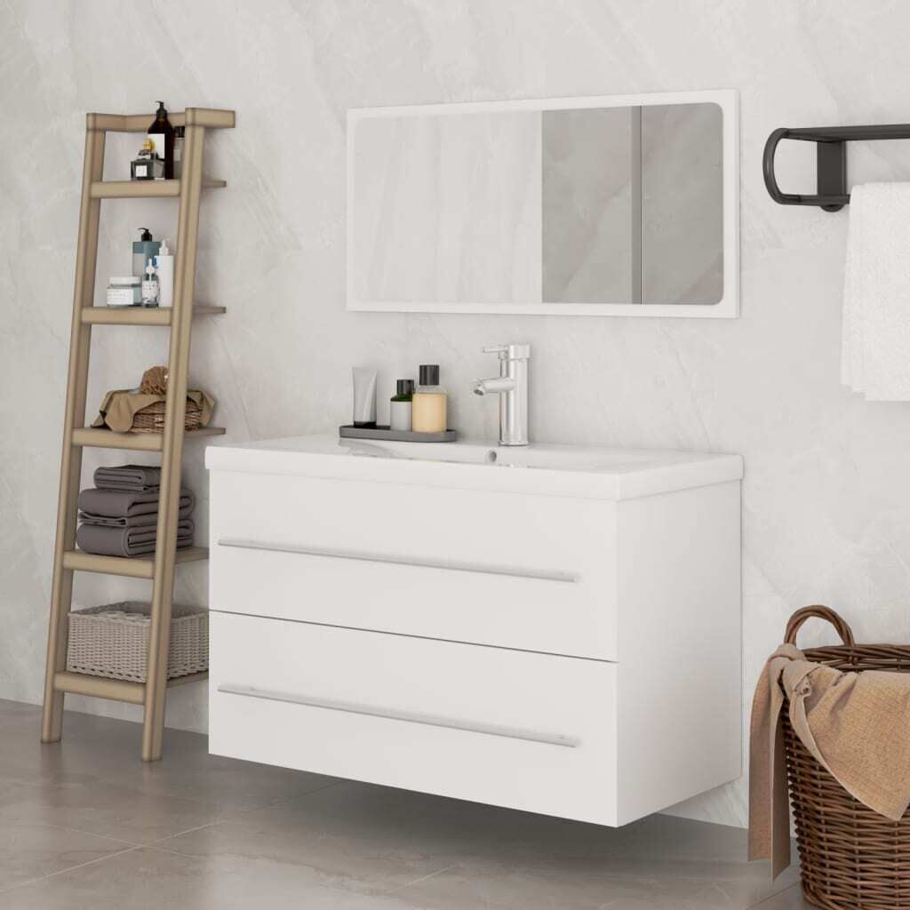 This stylish bathroom furniture set, featuring spacious storage space, is an excellent addition to your bathroom, giving it a tidy and striking appearance! Sturdy material: The under sink cabinet is made of engineered wood, that is of exceptional quality with smooth surface and also features strength, stability and resistance to moisture.Ample storage: The bathroom sink unit features a drawer, offering ample storage space to store items in your bathroom.Practical design: The top of this bathroom cabinet is ideal for placing the sink.Wall-mounted function: The bathroom cabinet and the make up mirror can be wall-mounted to add extra storage space. That way, you can maximise your floor space and keep the area clean.Overflow function: An overflow is also equipped to flow water out when it gets too full. Note:Screw(s) and plug(s) for inside the wall are not included. Seek and use screw(s) and plug(s) suitable for your walls. If you are uncertain, seek professional advice. Read and follow each step of the instruction carefully.The tap and the drain are not included in delivery.Each product comes with an assembly manual in the box for easy assembly.