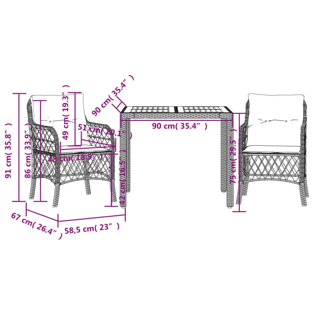 Enjoy a coffee or have a chat with your family and friends in the garden, backyard, or on the balcony with this comfortable bistro set! Durable material: PE rattan, also known as poly rattan, is a strong, low-maintenance synthetic material that looks like natural rattan. It's lightweight, easy to clean, and commonly used for outdoor furniture due to its durability and weather-resistant properties.Comfortable seat experience: This outdoor furniture set, complete with thickly padded cushions, offers a comfortable seating experience.Removable and washable cover: These seat cushions feature removable covers for easy washing and maintenance. Stable and easy-to-clean tabletop: This garden table has an acacia wood top that is sturdy, durable, and easy to clean with a damp cloth. Good to know:To make sure your outdoor furniture stays beautiful, we recommend protecting it with a waterproof cover.