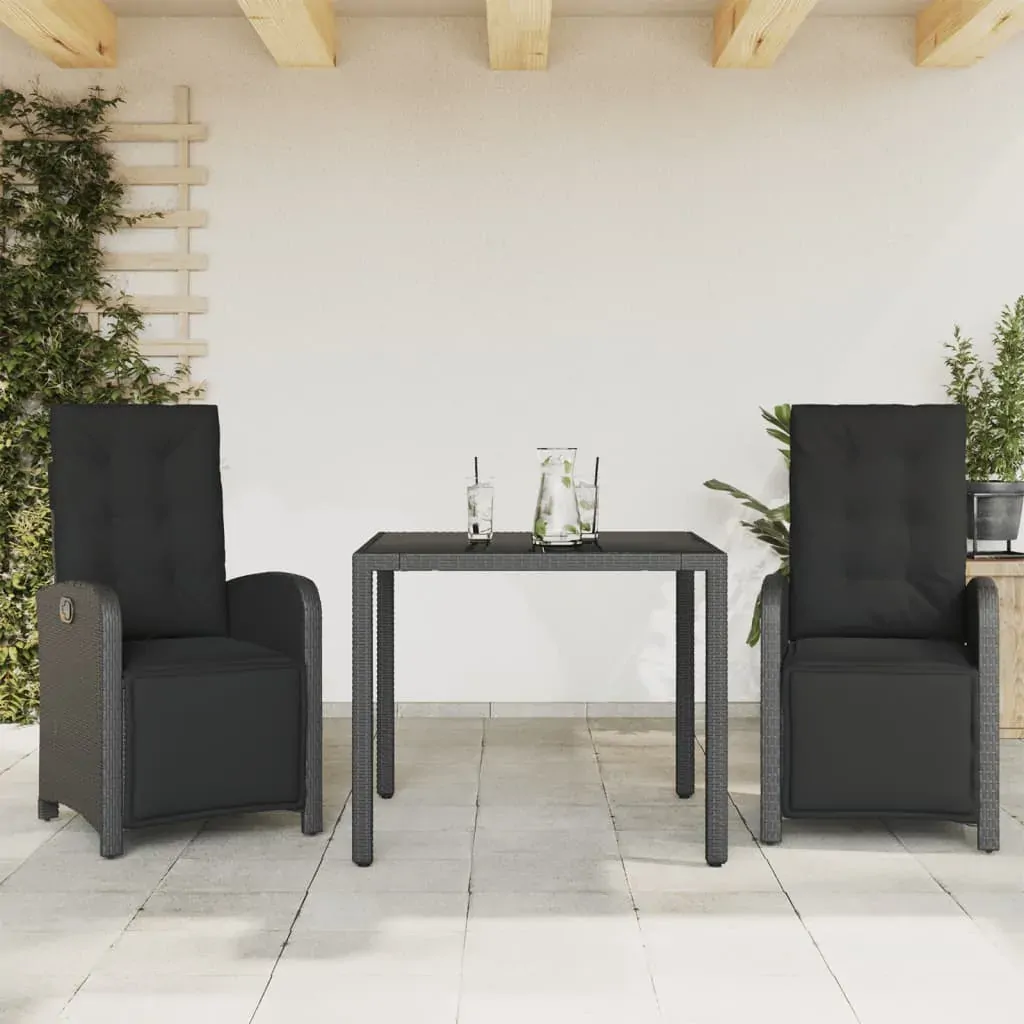 Enjoy a cup of coffee or have a chat with your family and friends in the garden, backyard, or on the balcony with this comfortable bistro set! Durable material: PE rattan, also known as poly rattan, is a strong, low-maintenance synthetic material that looks like natural rattan. It's lightweight, easy to clean, and commonly used for outdoor furniture due to its durability and weather-resistant properties.Adjustable backrest and footrest: This garden seat has a handle. You can adjust the backrest and footrest to any position by pulling the handle, and quickly return them to their original positions.Comfortable seat experience: This outdoor furniture, complete with thickly padded cushions, offers a comfortable seating experience.Removable and washable cover: These seat cushions feature removable covers for easy washing and maintenance. The back cushions have a flap at the back for easy attachment to the backrests.Glass tabletop: The outdoor table's top is made from strong and durable tempered glass, making it easy to clean with a damp cloth and adding a touch of elegance to your outdoor space. Good to know:To make sure your outdoor furniture stays beautiful, we recommend protecting it with a waterproof cover.