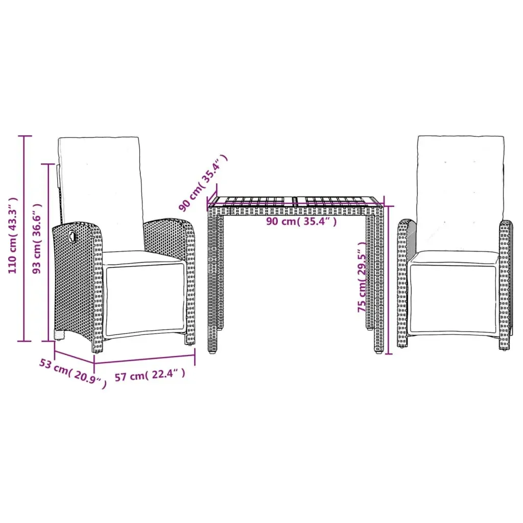 Enjoy a cup of coffee or have a chat with your family and friends in the garden, backyard, or on the balcony with this comfortable bistro set! Durable material: PE rattan, also known as poly rattan, is a strong, low-maintenance synthetic material that looks like natural rattan. It's lightweight, easy to clean, and commonly used for outdoor furniture due to its durability and weather-resistant properties.Adjustable backrest and footrest: This garden seat has a handle. You can adjust the backrest and footrest to any position by pulling the handle, and quickly return them to their original positions.Comfortable seat experience: This outdoor furniture, complete with thickly padded cushions, offers a comfortable seating experience.Removable and washable cover: These seat cushions feature removable covers for easy washing and maintenance. The back cushions have a flap at the back for easy attachment to the backrests.Stable and easy-to-clean tabletop: This garden table has an acacia wood top that is sturdy, durable, and easy to clean with a damp cloth. Good to know:To make sure your outdoor furniture stays beautiful, we recommend protecting it with a waterproof cover.