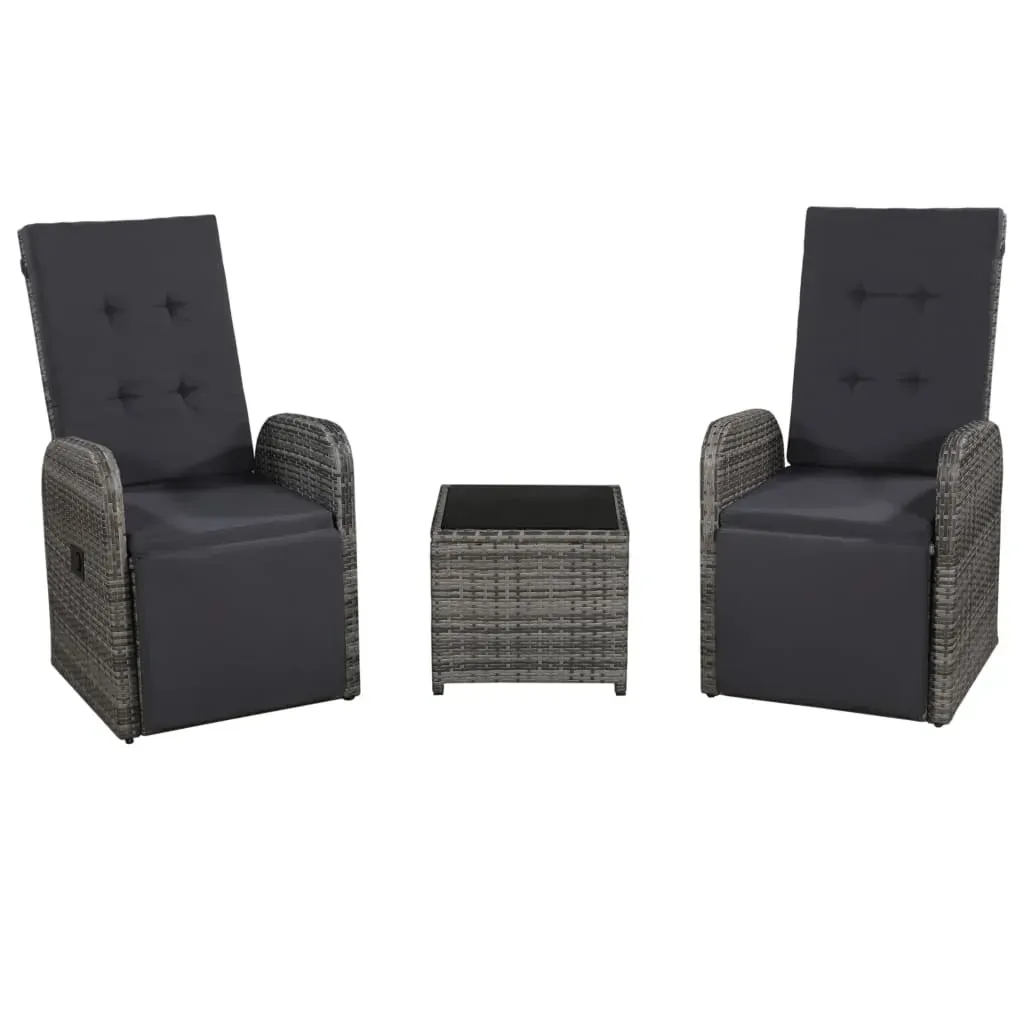 Our poly rattan bistro set will add a touch of modern elegance to your patio, balcony or garden with its understated, yet stylish design. Thanks to the reclining armchairs' adjustable backrest and footrest, you can comfortably sit back and fully relax. Made of weather-resistant PE rattan, the outdoor furniture set is easy to clean, hard-wearing and suitable for daily use. The powder-coated steel frame makes the armchairs and table very sturdy and durable. The table has a glass top. The reclining chairs give you all the comfort needed. The backrest will recline by pulling the button on the side. Thanks to the lightweight construction, the furniture set is easy to move. This set is also delivered with highly comfortable, thickly-padded seat cushions for the ultimate comfort. The low-maintenance polyester covers can also be removed and washed. Delivery includes 2 armchairs, 1 table and 2 seat cushions. The bistro set is easy to assemble. Note: We recommend covering the armchairs and table in the rain, snow and frost.