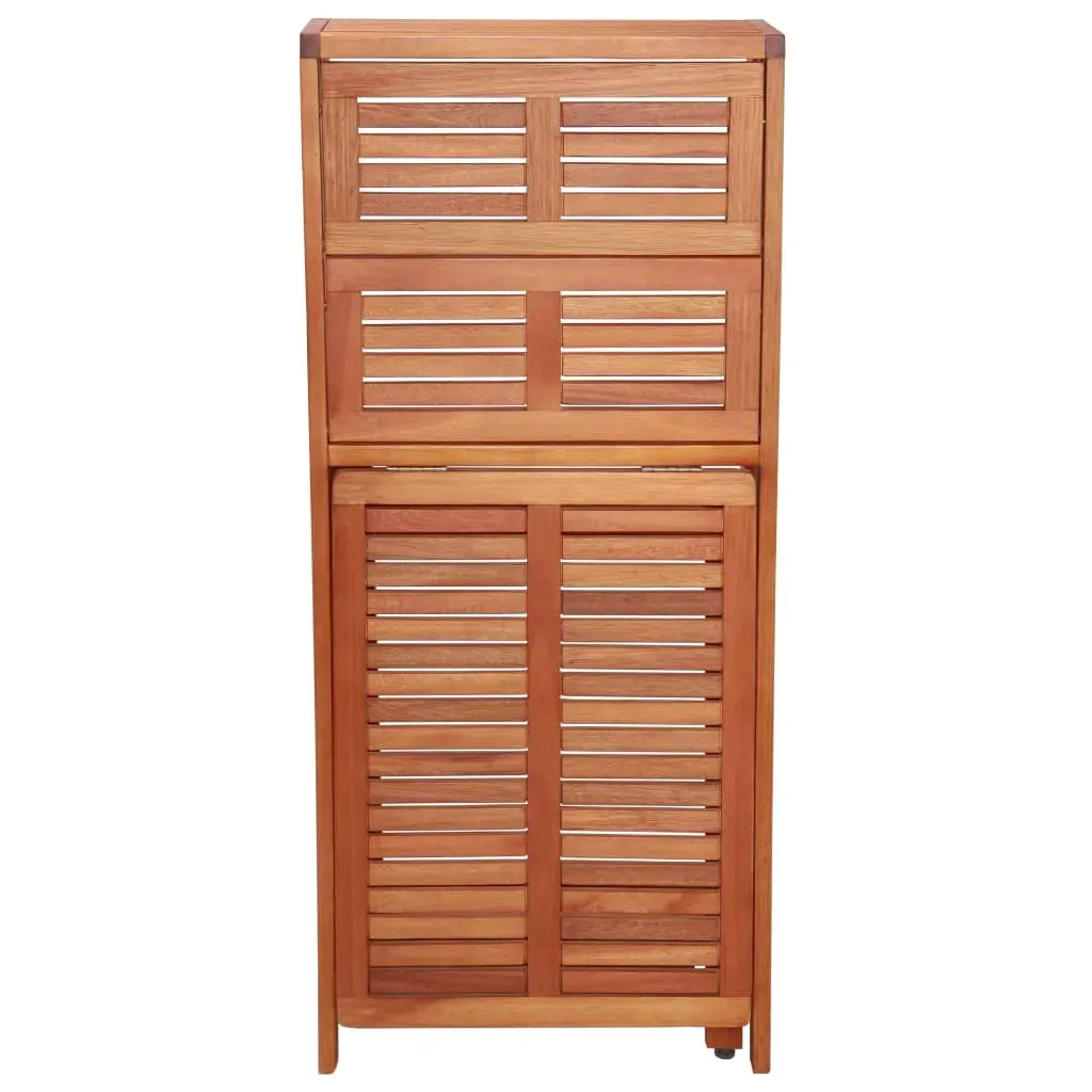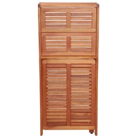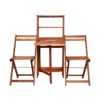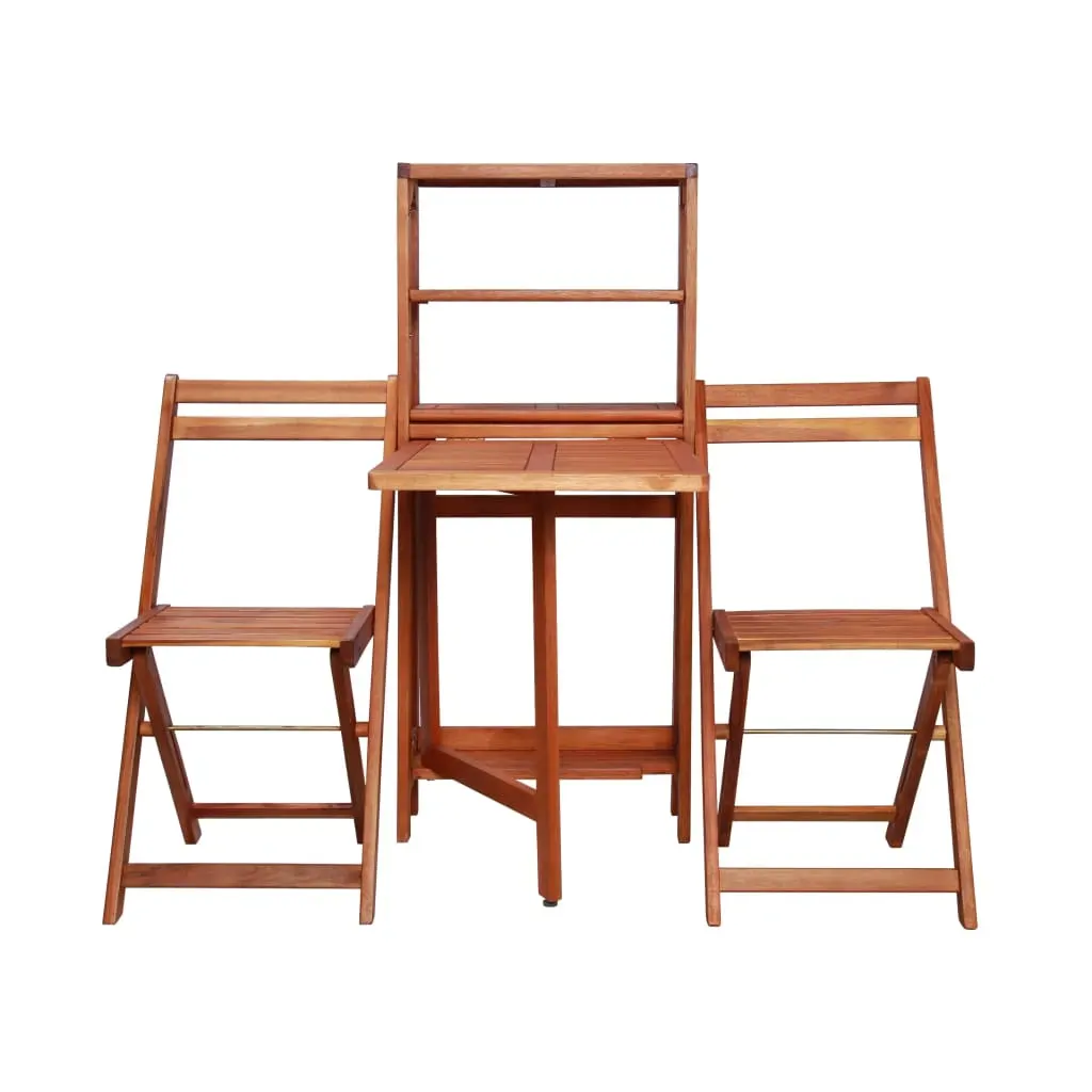 This wooden bistro set will make a great addition to your outdoor living space. Made of solid acacia wood, the set is weather-resistant and highly durable. The storage rack has been uniquely and functionally designed: you can use it as a table or keep it as a storage shelf according to your needs. The chairs can be folded and stored inside the table unit to save space when not in use. The bistro set is easy to assemble. Delivery includes 1 storage rack and 2 folding chairs.