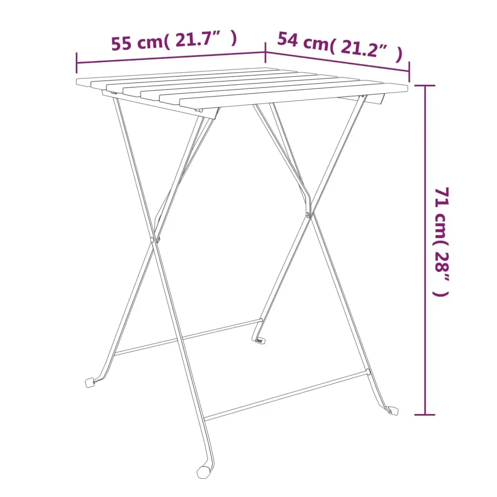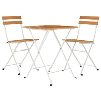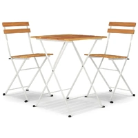 This 3 piece folding bistro set is an excellent choice for dining or relaxing in your garden, balcony or patio. Durable material: Solid acacia wood is a beautiful natural material. Acacia wood is a tropical hardwood, which is dense, sturdy, and durable.Stable frame: The steel frame ensures sturdiness and stability.Foldable design: The table and chairs can be easily folded away when not in use, for easy storage and transportation. Good to know:To make assembly as easy as possible, each product is delivered with a manual. Note:To make sure your outdoor furniture stays beautiful, we recommend protecting it with a waterproof cover.