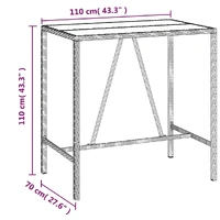 This trendy garden bar set, combining both style and function, is surely meant to be the centrepiece of your garden, patio, and any other living space. Weather-resistant material: PE rattan, also known as poly rattan, is weather resistant and easy to clean. It remains beautiful on the outside for a long period of time. It offers great quality, convenience and an aesthetic look.Comfortable seating: The bar stool is designed with footrest, backrest and armrests to offer you a comfortable seating experience. The soft seat and back cushions also add extra comfort.Tempered glass tabletop: The tabletop is made of tempered glass, making it easy to clean. Additionally, it offers excellent support for holding your drinks, snacks, and your favourite decorations.Sturdy and stable frame: The powder-coated steel frames make the pub set sturdy and stable for daily outdoor use.Wide applications: The bar table and stools, with its remarkable design, create a pleasant overall appearance that integrates effortlessly into any environment. Good to know:To make sure your outdoor furniture stays beautiful, we recommend protecting it with a waterproof cover.