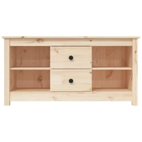 This trendy wooden TV cabinet, featuring a sleek and stylish design, is meant to be a decorative as well as practical addition to your room decor. Solid pine wood: Solid pine wood is a beautiful natural material. Pine wood has a straight grain, and the knots give the material its signature, rustic look.Stable frame: The wooden frame ensures sturdiness and stability.Ample storage space: The TV unit has 2 drawers and 4 open compartments, offering sufficient storage space to keep your essentials well organised and within reach.Displaying function: The sturdy top is a perfect spot for displaying potted plants, framed photos and other decorative items. WARNING:In order to prevent overturning, this product must be used with the wall attachment device provided. Note:Each product comes with an assembly manual in the box for easy assembly.