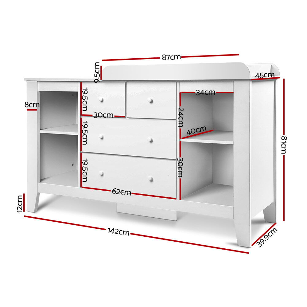 Impeccably designed, our practical Keezi Baby Change Table is the perfect storage solution for your little one. The baby change table makes changing your baby's diapers and clothing a breeze. It also features four spacious drawers and four open shelves to offer ample storage space for all your baby supplies, including diapers, clothes, accessories, toys and more. The top change platform can be easily removed for extra table space, so that you can use the baby change table as a normal storage chest in the children's room or even the master bedroom. Most importantly, it is finely finished with certified non-toxic paint that is completely safe for you and your baby.