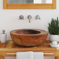 This unique wash basin, made of solid teak with a water-repellant finish, exudes a rustic charm and is a real eye-catcher in your bathroom or washroom. It should be mounted above counter. This striking basin is not only a practical sink for everyday use, but also an adornment for your living space. It is fully handmade and the craftsmanship adds to its spectacular retro and natural style. It will definitely suit any interior style. In addition, the basin is very easy to clean. Important note: As wood is a natural product, the colours, grain patterns and shapes vary from piece to piece, making each of our wash basins unique and different from the next. The delivery is random, ensuring the exclusivity and individuality of your product.