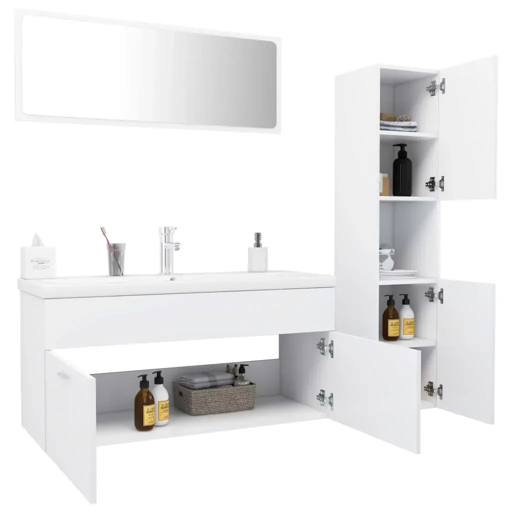 With this stylish bathroom furniture set, you can create additional storage space for your bathroom with a striking, tidy appearance. The clean lines and sleek design blend into your bathroom perfectly. The furniture set consists of a sink cabinet with a sink, a high cabinet, and a mirror. The chic basin cabinet has 1 compartment and fits perfectly under your sink, making your bathroom storage quite convenient. Made of ceramic, the basin can not only serve as a vessel for daily use but also as an adornment in your living space. Thanks to its trendsetting and contemporary design, this washbasin will definitely suit any decor. An overflow is also equipped to flow water out when it gets too full. The high cabinet features a total of 5 compartments and 2 doors, offering ample space to store items in your bathroom. The mirror also adds an excellent appearance to your home decor. Additionally, this bathroom set is easy to clean with a damp cloth. Please note: The tap and drain are not included in the delivery.