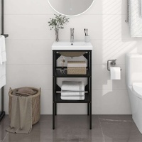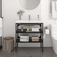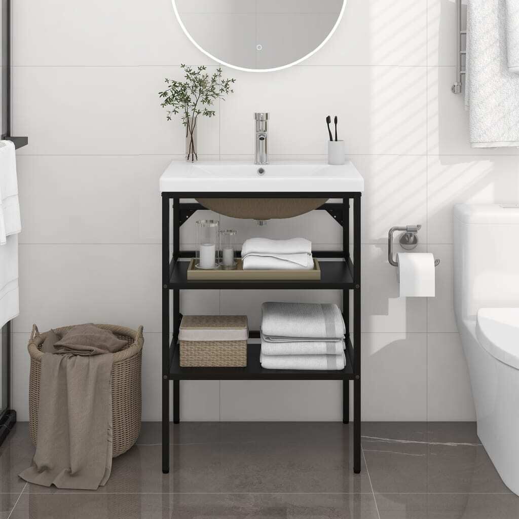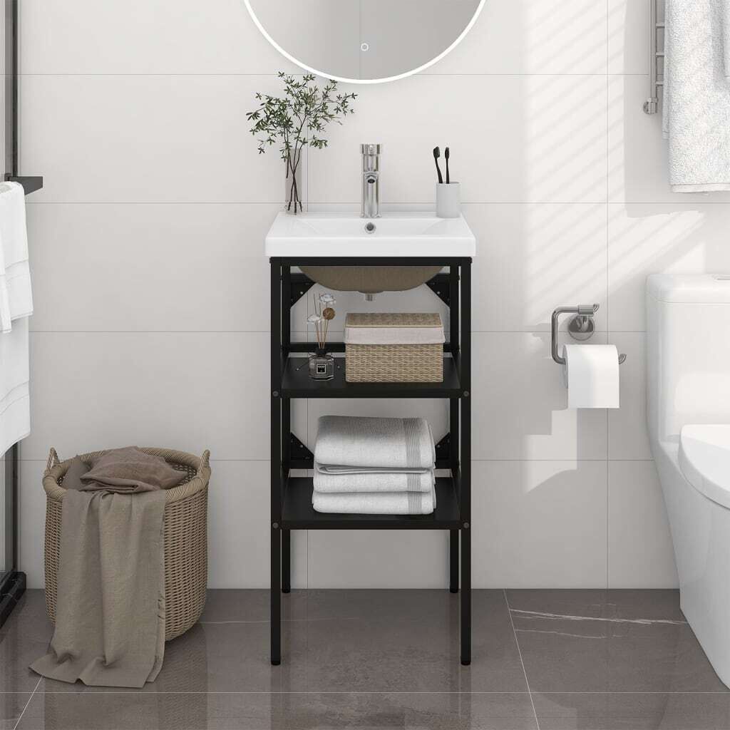 The wash stand is made of powder-coated iron, making it stable and durable. This washbasin frame gives easy access to towels and baskets and creates a more ample space than closed storage. Made of ceramic, the basin can not only serve as a vessel for daily use but also as an adornment in your living space. Thanks to its trendsetting and contemporary design, this washbasin will definitely suit any decor. An overflow is also equipped to flow water out when it gets too full. Its glazed surface brings itself a modern yet elegant design. Additionally, the washbasin frame and basin are easy to clean with a damp cloth.