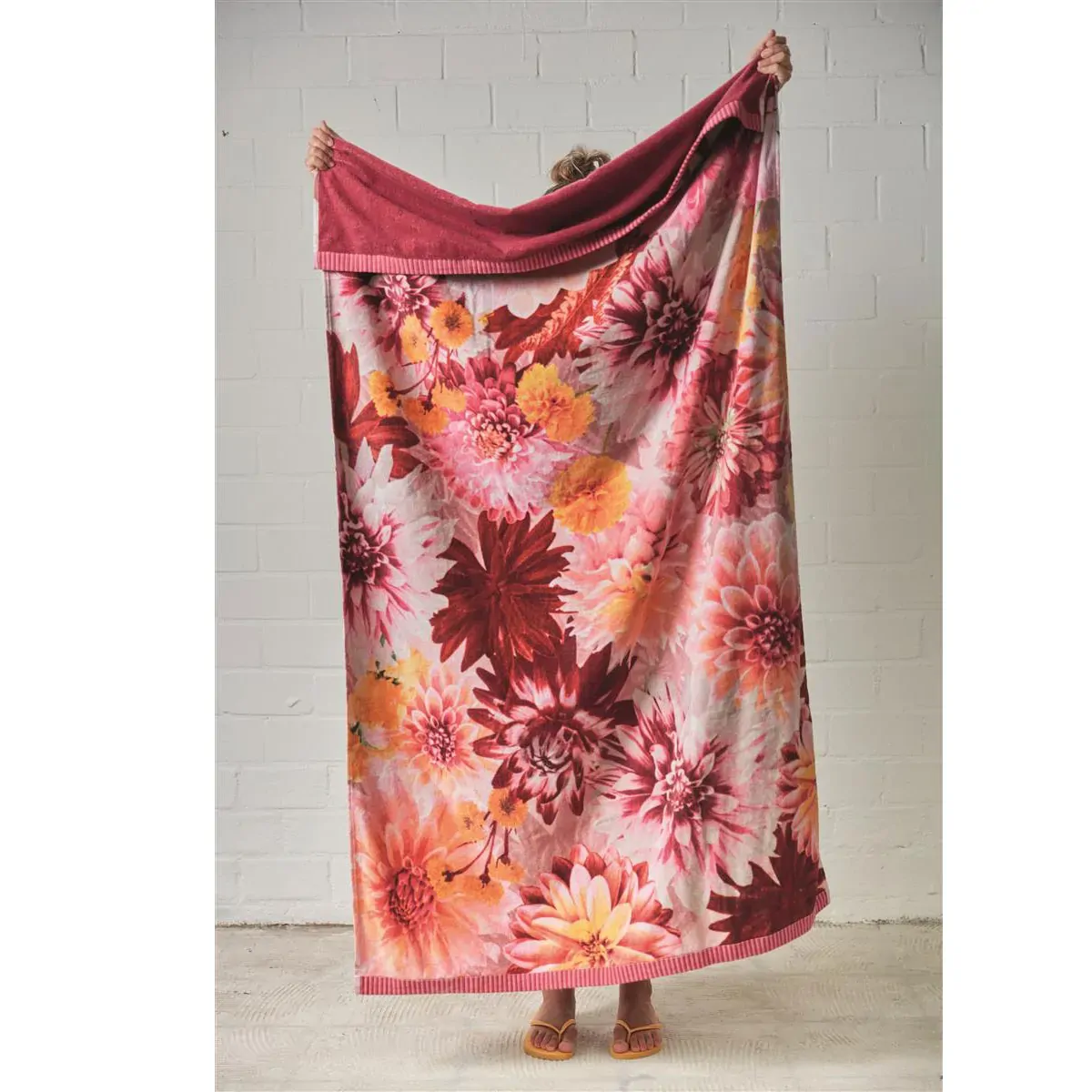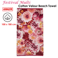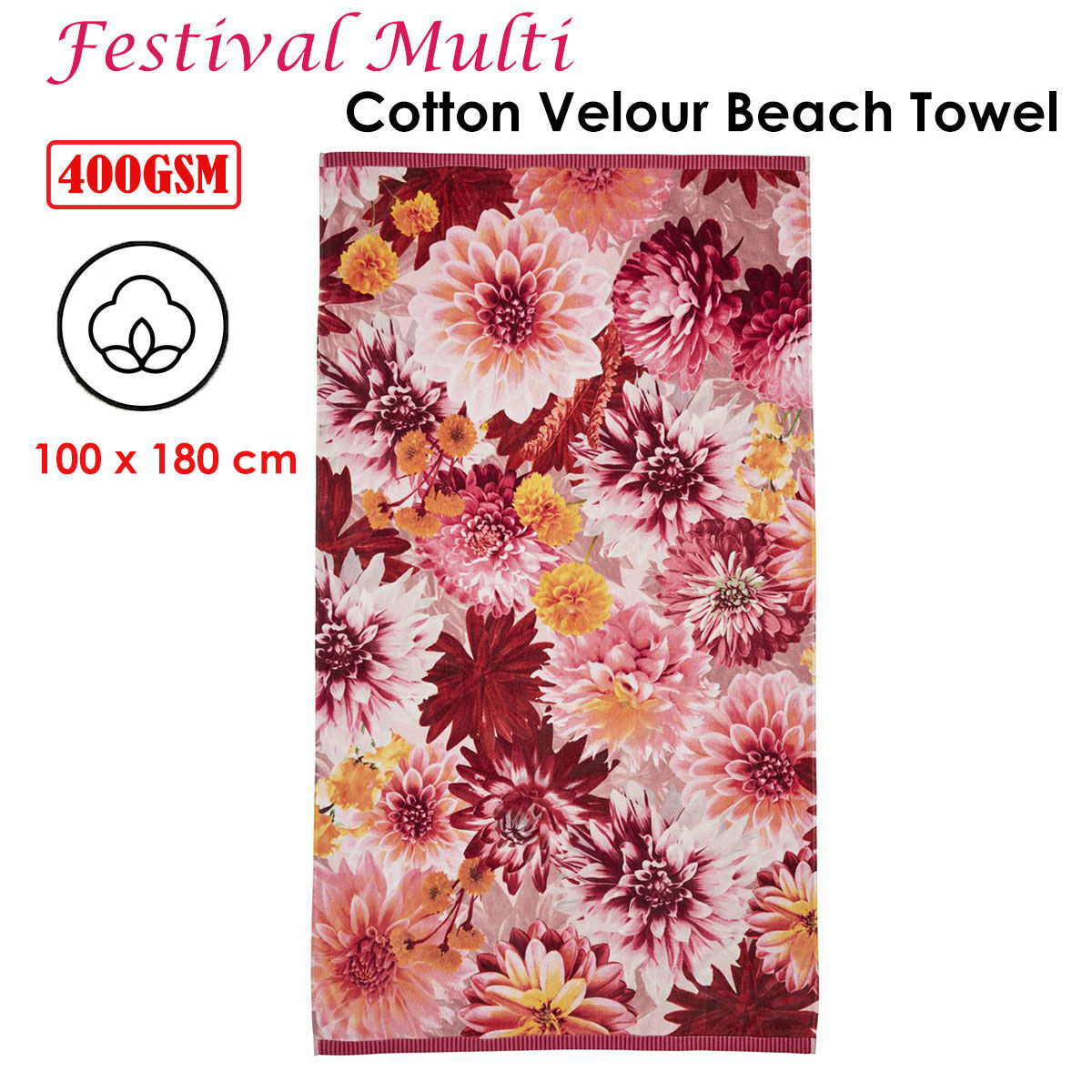 This 400gsm Festival Multi Cotton Velour Beach Towel 100cm x 180cm by Bedding House certainly lives up to its name! The towel features a cheerful print of a sea of flowers. The back is dark pink. The colours hot pink, pink, red, yellow, and orange dominate this vibrant design.
