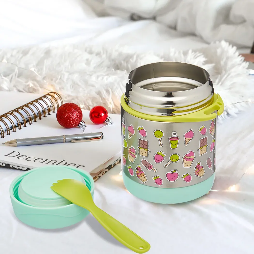 Decorated with popular children?s cartoons, this kids? food jar keeps food cold for up to 8 hours and hot for up to 12 hours. Great for kids to take to school, its durable stainless steel interior and exterior is strong enough to survive bumps and knocks. So you can rest assured your children will have a healthy hot, or cold meal. Exclusively designed for kids, the wide mouth is easy to fill, eat from and easy to clean. Treat your kids with healthy salads, pasta, soups, noodles and lots more. Comes with a free spoon and fits perfectly in a school bag.