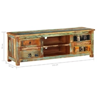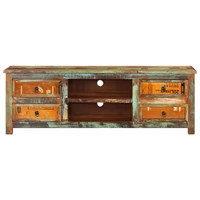 This antique-style wooden TV cabinet is both stylish and practical with spacious storage drawers and shelves. It is surely a great addition to the living room or the bedroom. This TV cabinet is made from reclaimed wood, which means that every piece of furniture is unique and slightly different from the other. The furniture made from reclaimed wood has characteristics of different woods like teakwood, acacia, mango wood, saal wood etc. Reclaimed wood is solid, stable, durable, and beautiful. The nail holes or clear-faced grains bring their history with them and invite another generation to permeate them with their own. Keeping this piece of furniture at home will show your concept of resource conservation, environment protection and sustainable development. Pure handmade crafting adds the vintage spectacular style to the TV cabinet and feasts you with exotic flavour. Every process of recombining, polishing, painting and waxing is elaborately prepared. Important note: Colours vary from piece to piece, making each of our TV cabinets unique. The delivery is random, ensuring the exclusivity and individuality of your product.