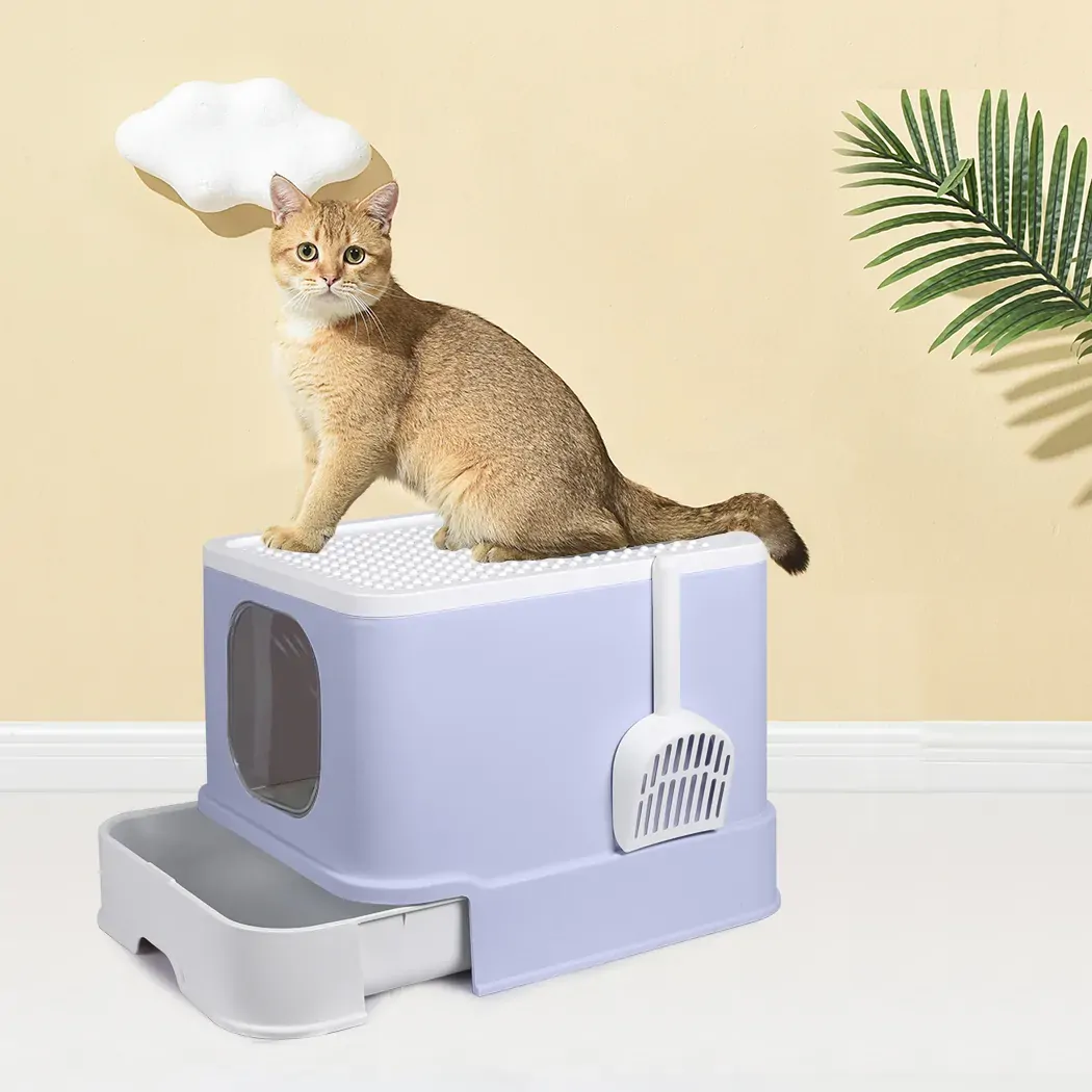 Our Cat litter box is an essential household product for cat parents. Let your cat do its business peacefully, built-in miniature vents on the top of the litter box. Provides excellent privacy for your cat with excellent ventilation. Let them perform this crucial task of the day, without any worries. A double-door design effectively avoids the litter mess. Convex points are provided on the surface, it helps the claws to open-up for the cat litter to fall off. It avoids skin diseases caused by residual litter on the claws. Its spacious design can accommodate up to 20kg capacity. This large space gives enough space for the cat to freely move around. A bonus litter shovel is provided for easy cleaning. Dust and dirt can be easily cleaned due to its hassle-free design. Bottom drawer is provided for convenient cleaning. Give your cat a private space and a sense of security. An adorable product for your adorable cat.