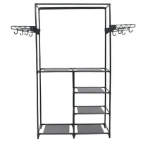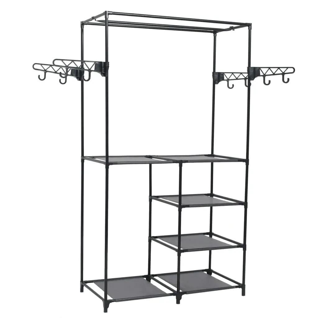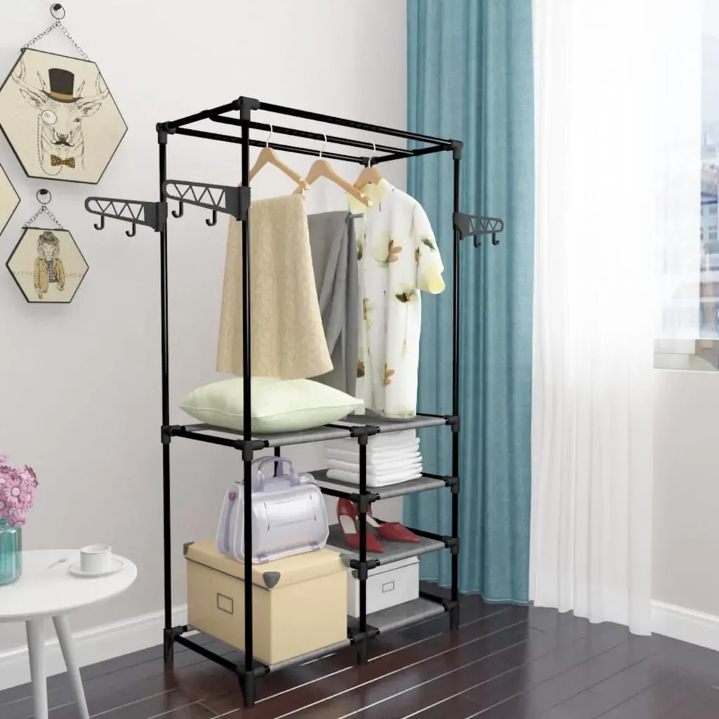 This minimalistic clothes rack is an ideal storage solution for the bedroom or bathroom. It has a tubular, powder-coated steel frame, which is lightweight yet sturdy, making the clothes rack easy to move around and quite durable. It has four shelves that are made of a non-woven fabric, and designed to keep your bags, shoes or small items organised and within reach. It also has four side arms with hooks for additional storage space for your longer clothing like coats and jackets. Assembly is easy.