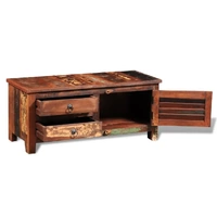 This antique-style wooden side cabinet, coming with 1 door and 2 drawers, offers you certain storage space and helps you to maintain your items in great order. You can also put a desk lamp, toiletries or some decorations on the sturdy top surface. This TV/Hi-Fi cabinet is made from reclaimed wood, which means that every piece of furniture is unique and slightly different from each other. The furniture made from reclaimed wood has characteristics of different woods like teakwood, acacia, mango wood, saal wood etc. Reclaimed wood is solid, stable, durable, and beautiful. The nail holes or clear-faced grains bring their history with them and invite another generation to permeate them with their own. Keeping this piece of furniture at home will show your concept of resource conservation, environment protection and sustainable development. Pure handmade craftsmanship adds the vintage spectacular style to the cabinet and feasts you with exotic flavour. Every process of recombining, polishing, painting and waxing is elaborately prepared. The antique side cabinet will surely be a perfect addition to your home! Important note: Colours vary from piece to piece, making each of our cabinets unique. The delivery is random, ensuring the exclusivity and individuality of your product.