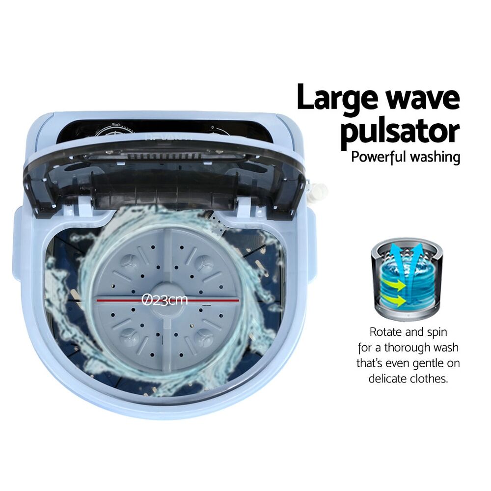 Need to a better way to wash your clothes while on road trips and out camping? Then our Devanti Portable Washing Machine is just the thing for you. Featuring a lightweight 2-in-1 wash and spin dry design, the washing machine has a powerful wave pulsator that washes and cleans with purpose. It is easy to use with simple rotary knobs for wash and spin-dry functions as well as 15-minute timer control. And no worries too about washing delicate clothes as this machine is gentle on all fabrics with its intelligent wash cycles. Best of all, the washing machine comes included with a shoe brush for you to wash up to four pairs of shoes at once. With a capacity to handle up to a 3kg laundry load, our practical portable washing machine also features a detachable spin basket, built-in handles, reliable copper-wire motor and not least, a quiet and efficient operation at all times.