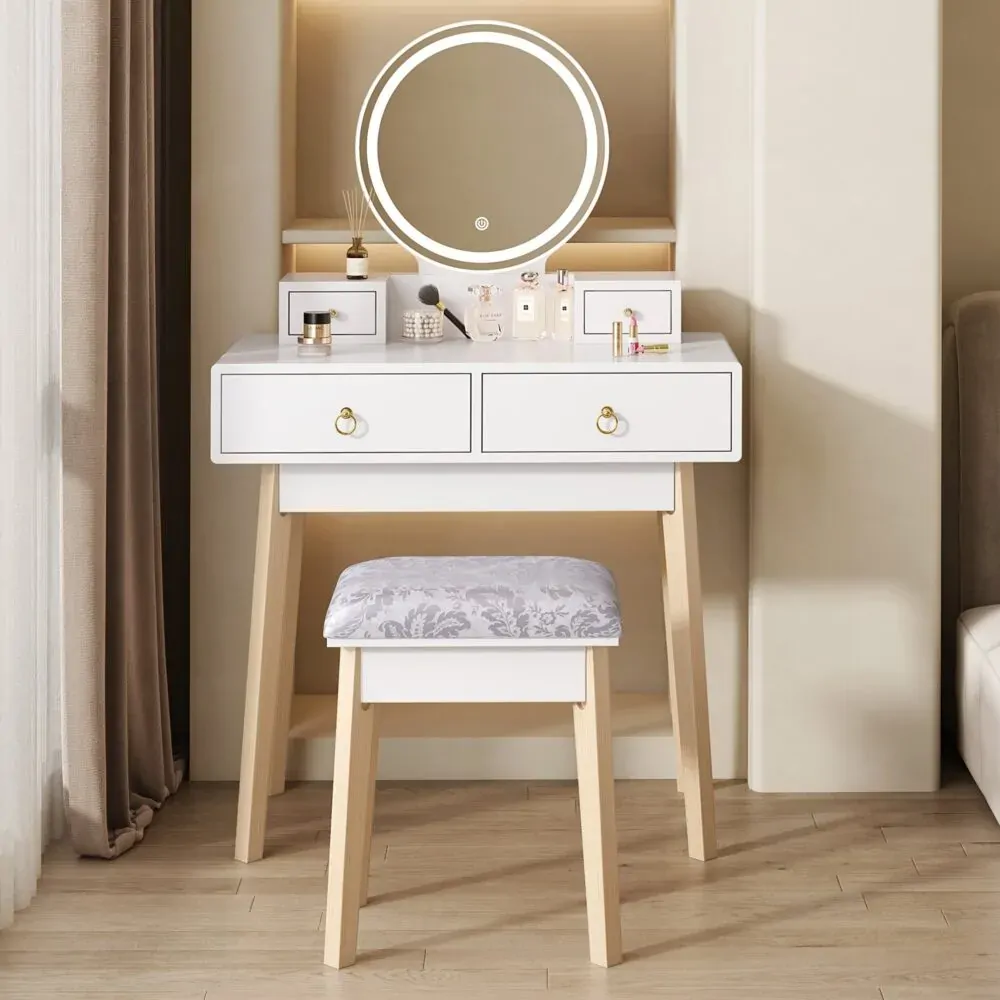 Ideally made this admirable vanity table set with a touch screen freely mirror lamps, this one is sure to impress your guests. With 3 color lighting modes, it will create you an effortless and professional make-up mirror when in different sunlight. This set also comes with ample storage options for convenience to separately store your makeup, jewelry, and cosmetics. Also, the storage drawers will greatly classifies and eliminates the time-consuming search for your make-up tools and beauty essentials.