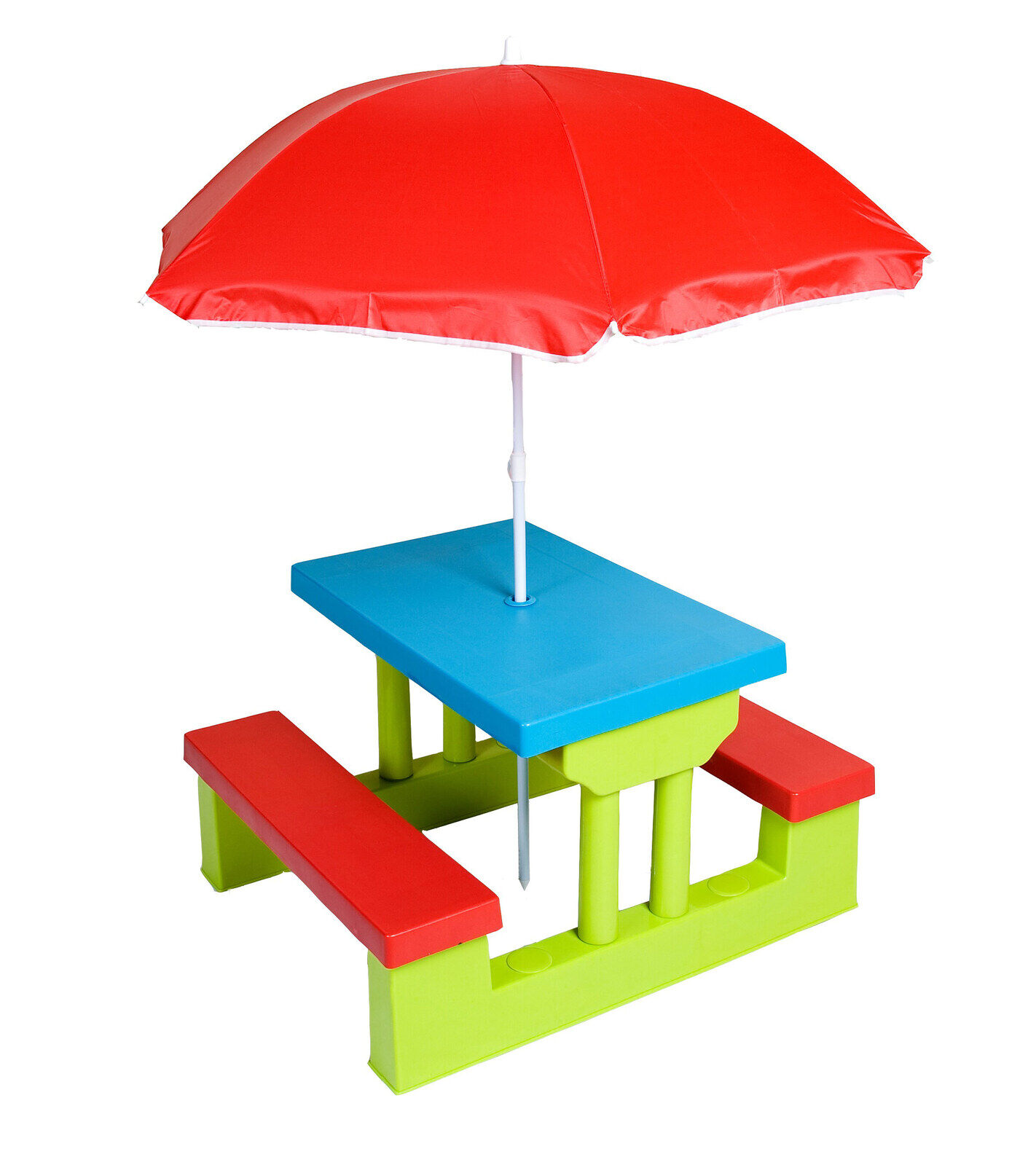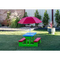 The Hacienda Kids Picnic Table Set with Umbrella is perfect for outdoor fun! It's versatile, with ample space for activities, easy to clean, and lightweight for hassle-free handling.