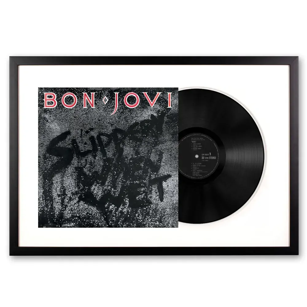 Framed Bon Jovi Slippery When Wet Vinyl Album Art - We are eager to honour and showcase this art form by framing the actual original artist's vinyl cover and vinyl record themselves. This record is framed using all wood profiles, archival matting, and UV-filtering non-glare acrylic. The cover artwork is presented in full, while the actual vinyl peeks out of the sleeve. The outer dimensions of each frame are 75 cm x 47.5 cm.