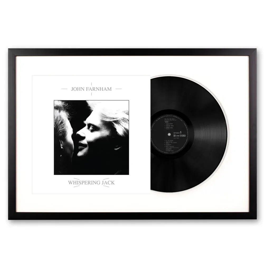 Framed John Farnham Whispering Jack Vinyl Album Art - We are eager to honour and showcase this art form by framing the actual original artist's vinyl cover and vinyl record themselves. This record is framed using all wood profiles, archival matting, and UV-filtering non-glare acrylic. The cover artwork is presented in full, while the actual vinyl peeks out of the sleeve. The outer dimensions of each frame are 75 cm x 47.5 cm.