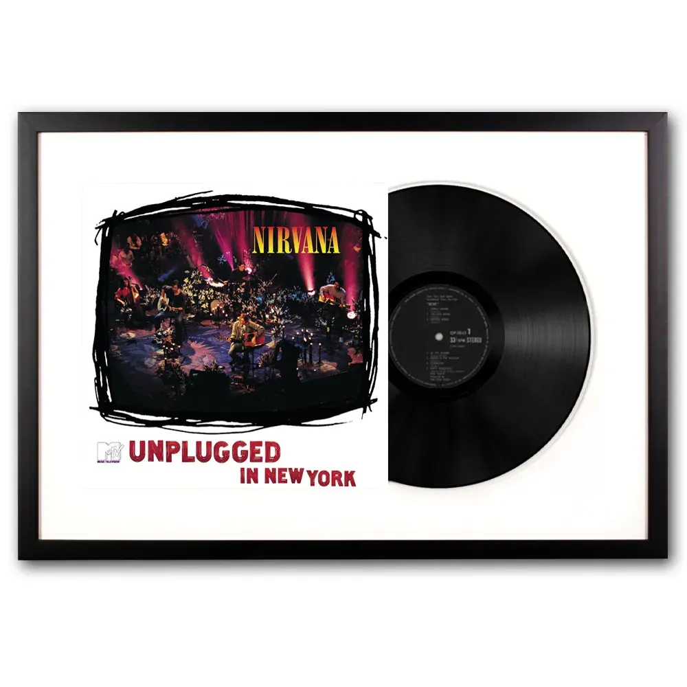 Framed Nirvana MTV Unplugged Vinyl Album Art - We are eager to honour and showcase this art form by framing the actual original artist's vinyl cover and vinyl record themselves. This record is framed using all wood profiles, archival matting, and UV-filtering non-glare acrylic. The cover artwork is presented in full, while the actual vinyl peeks out of the sleeve. The outer dimensions of each frame are 75 cm x 47.5 cm.