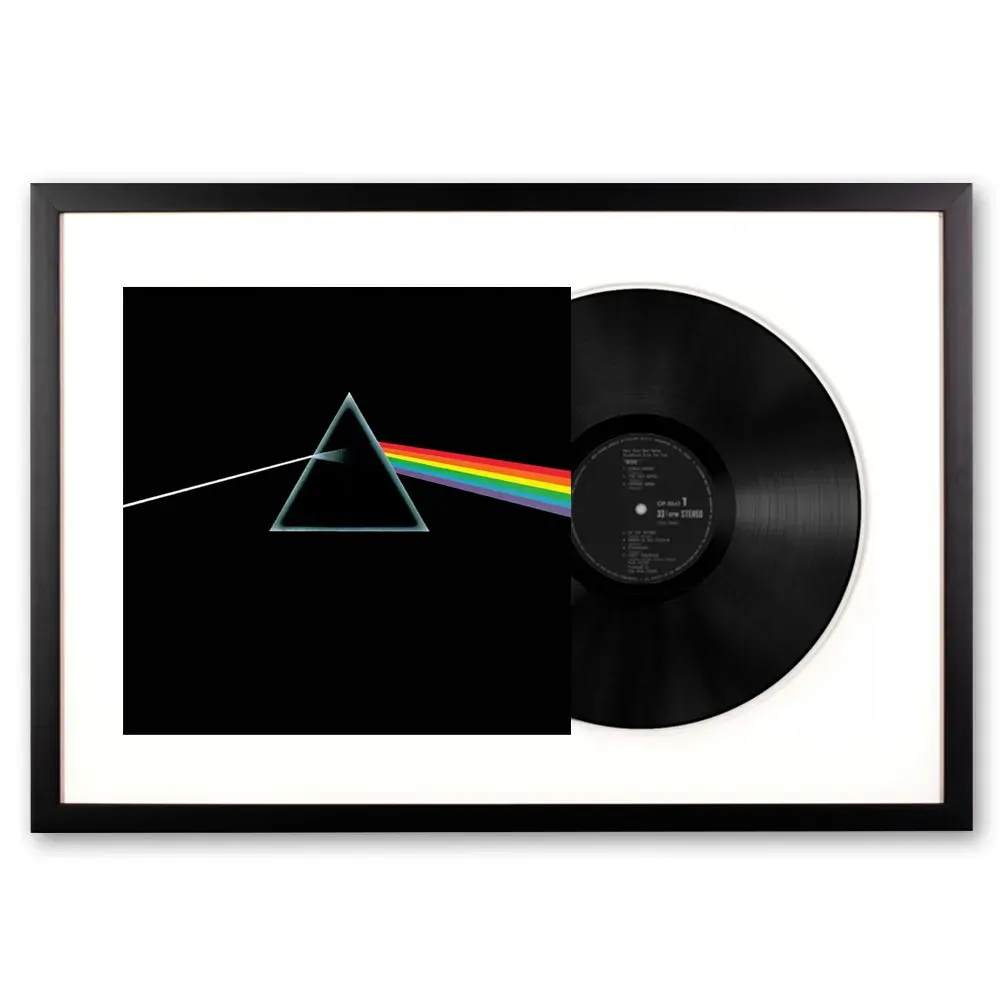 Framed Pink Floyd the Dark Side of The Moon Vinyl Album Art - We are eager to honour and showcase this art form by framing the actual original artist's vinyl cover and vinyl record themselves. This record is framed using all wood profiles, archival matting, and UV-filtering non-glare acrylic. The cover artwork is presented in full, while the actual vinyl peeks out of the sleeve. The outer dimensions of each frame are 75 cm x 47.5 cm.