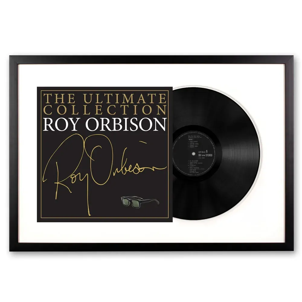 Framed Roy Orbison the Ultimate Collection Vinyl Album Art - We are eager to honour and showcase this art form by framing the actual original artist's vinyl cover and vinyl record themselves. This record is framed using all wood profiles, archival matting, and UV-filtering non-glare acrylic. The cover artwork is presented in full, while the actual vinyl peeks out of the sleeve. The outer dimensions of each frame are 75 cm x 47.5 cm.