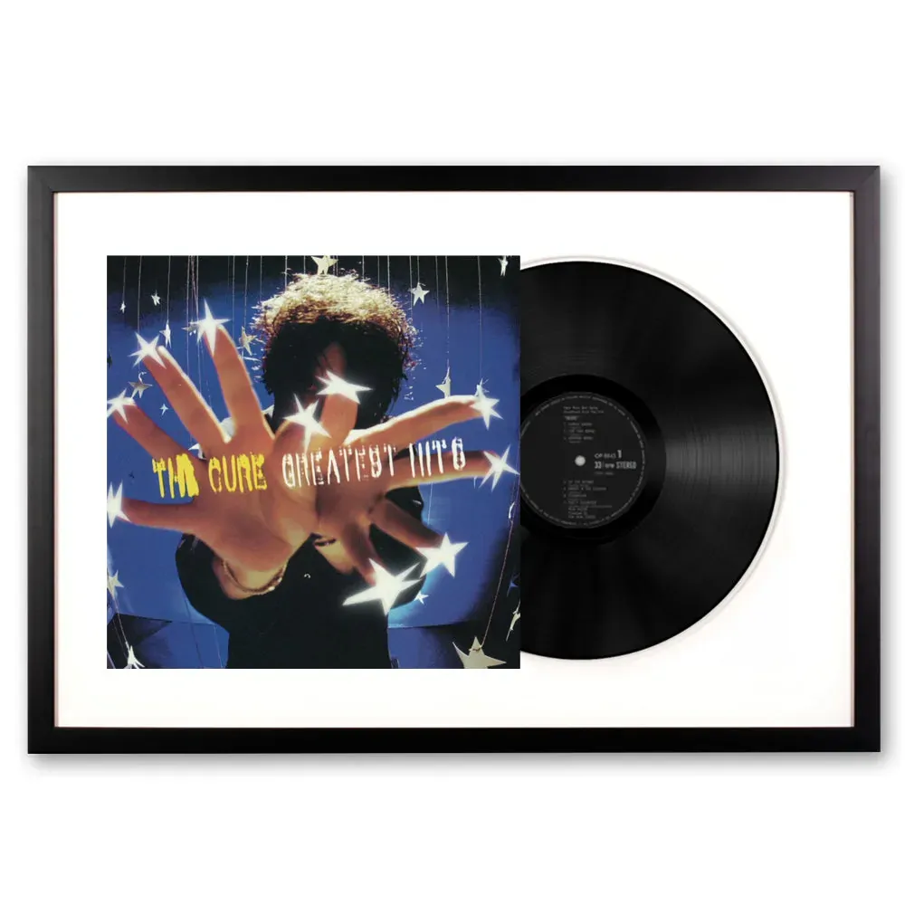 Framed The Cure Greatest Hits - Double Vinyl Album Art - We are eager to honour and showcase this art form by framing the actual original artist's vinyl cover and vinyl record themselves. This record is framed using all wood profiles, archival matting, and UV-filtering non-glare acrylic. The cover artwork is presented in full, while the actual vinyl peeks out of the sleeve. The outer dimensions of each frame are 75 cm x 47.5 cm.