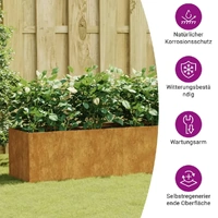 This garden rasied bed would be great for DIY enthusiasts to decorate your gardens, balconies, or patios. Durable material: Corten steel, also known as weathering steel. This is anti-corrosive by its very nature. It develops a rusty protective layer against corrosion when first exposed to atmospheric conditions. Thus, you don't need to paint it. This can help you save on maintenance and repair costs. The distinctive brown colour on the corten steel will surely be an eye-catcher. Finally, weathering steel is exceptionally durable and will stand up to the test of time. Ample space: The planter is deep and wide enough to hold a large amount of soil and provide ample space for your plants, vegetables, herbs, and flowers.Extra support: The interior support brackets of the raised bed ensure sturdiness and stability.Decorative function: The garden pot can hold your favourite plants or flowers, which is ideal for your garden as decoration.Open bottom design: This planter box has an open bottom design that allows excess water to drain away easily, while also allowing plant roots to extend freely and absorb more nutrients from the soil. Good to know:This product is not rusted yet and has a normal metal colour when you receive it, but rust will develop over time. You could speed up the rusting process by spraying it with soap water and salt water. To keep your clothes stain-free, avoid contact with the developing rust layer.This raised bed does not include a bottom.