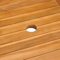 This wooden outdoor dining table has a classic design and is perfect for al fresco dining in the garden or on the patio. Constructed from extremely durable teak hard wood, this piece of teak furniture has been seasoned, kiln dried and then fine sanded to give a very smooth appearance. Teak wood is known for its exceptional strength and weather resistance, making it far more suitable for garden furniture than any other kind of wood. Teak wood is the perfect choice if you want to purchase a long lasting piece of garden furniture. The surface is easy to clean with a damp cloth. The tabletop has a parasol hole, so you can enjoy the summer breeze without worrying about the burning sun. Delivery includes 1 dining table. Please note that a parasol is not included in the delivery.