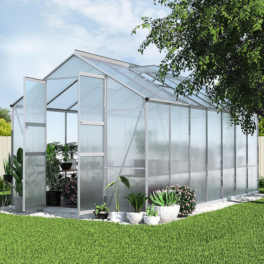 This spacious greenhouse has a massive volume of 8.97m? and can accommodate a considerable number of plants and vegetables. Covered with twin-wall UV-resistant polycarbonate panels, the Green house allows up to 90% light transmission and helps to eliminate the risk of plant burn effectively. It also has a unique triangular Aluminium framework for enhanced durability and stability, two adjustable roof vents for good air flow and moisture and not least, an effective gutter system for smooth drainage.