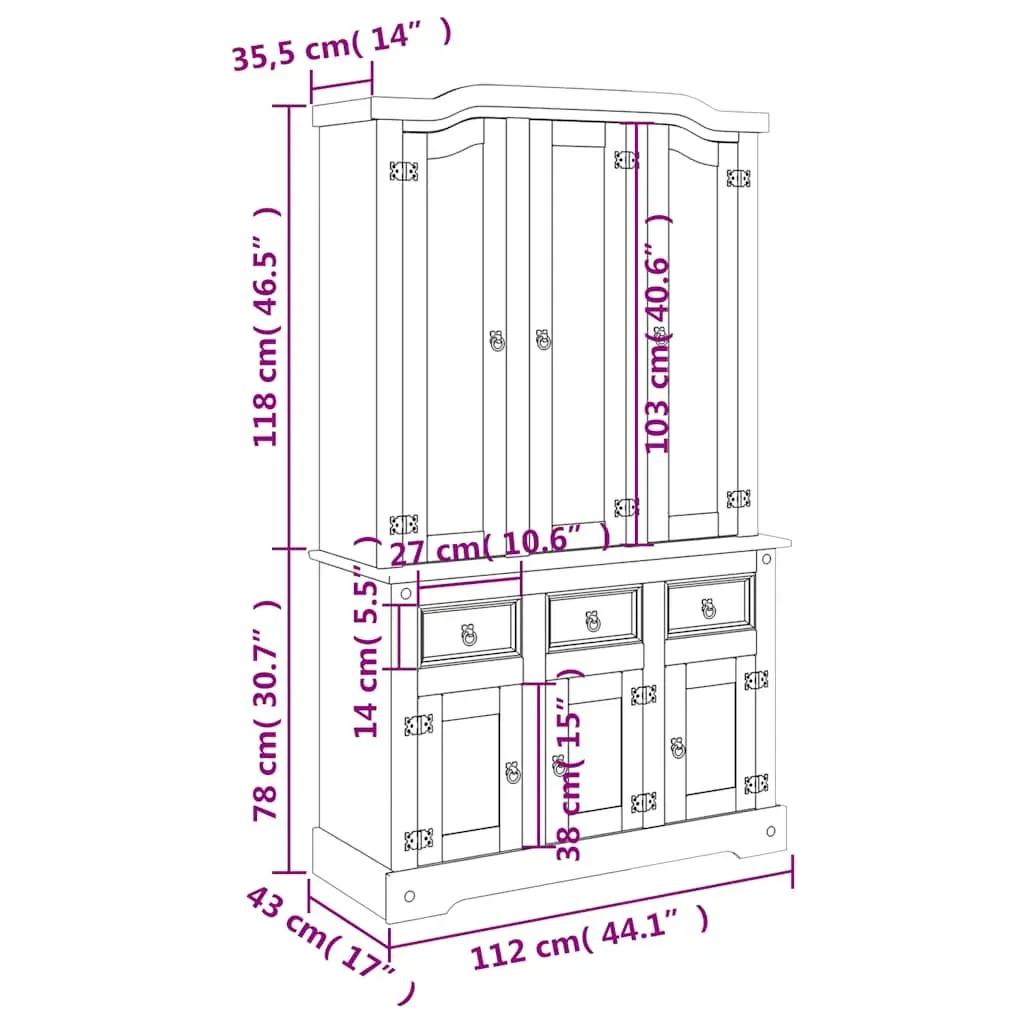 Are you hunting for a stylish highboard? This wooden highboard adds an elegant charm to your existing interior! Solid pine wood: Solid pine wood is a beautiful natural material. Pine wood has a straight grain, and the knots give the material its signature, rustic look.Ample storage space: The cabinet features shelves and drawers, providing ample storage space for keeping your various daily essentials well-organised and within easy reach.Practical doors: Keep your space clutter-free by hiding small essentials behind the doors of the sideboard. Warning:To prevent it being overturned, this product must be used with the provided wall attachment device.