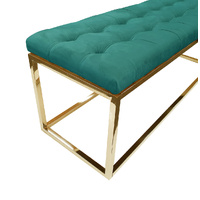 The ottoman is made from high-quality materials, including stainless steel with a gold finish and tufted velvet upholstery in green. The combination of these materials creates a sophisticated and modern look that will complement any decor style.