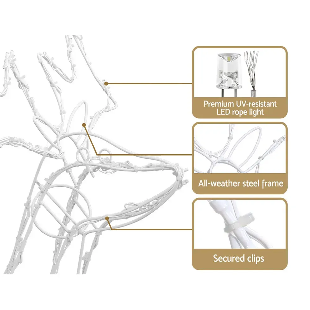 Bring the brilliance of Christmas to your home with our mesmerising Jingle Jollys 2PC LED Reindeer Light. The reindeer light comes in a family of two reindeers: one in a feeding position and one in a standing position. A rope light of 100 super bright LED bulbs is set in a sturdy white metal frame. There are multiple flashing effects and you can even adjust the speed to zero to stop the flashing altogether. The reindeer light is waterproof and UV-resistant so you can place it indoors in your living room, or outdoors in the front yard for all your neighbours to appreciate. Best of all, it is solar powered so you can leave it out well into the new year without worrying about the energy bills. Create a lively and bright Christmas ambience throughout the season.