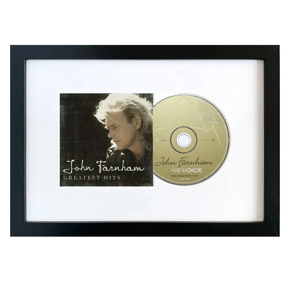Framed John Farnham 'Greatest Hits' CD Album Art is one of our lifetime's most recognisable and significant albums. We are eager to honour and showcase your favourite artists by framing the actual original artist's CD cover and the CD itself. This CD is framed using all-wood profiles, archival matting, and UV-filtering non-glare acrylic. The cover artwork is presented in full, while the actual CD peeks out of the side. The outer dimensions of each frame are WH 32.5cm x 23.5cm.