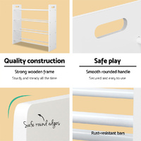 The entire unit is well-built with particle board that has a lovely Melamine finish and strong metal tubes painted in white non-toxic paint. Easy to clean and maintain, our Multi-bin Toy Rack is simply a joy to have for all things neat and tidy.