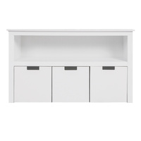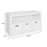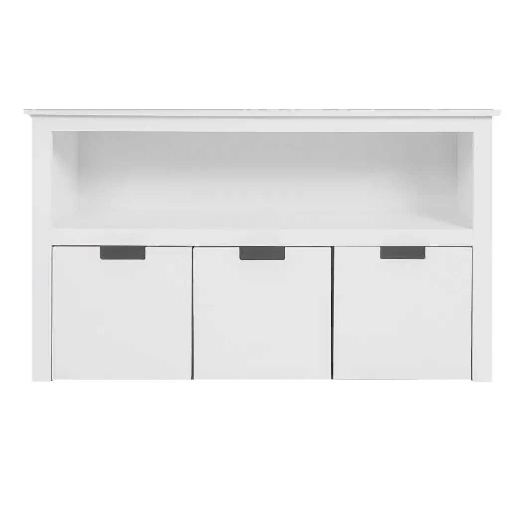 Your playroom storage chest can fit into any room in the house. Living room bedroom kid’s playroom and more. Store toys in the drawers below and books on the shelves.