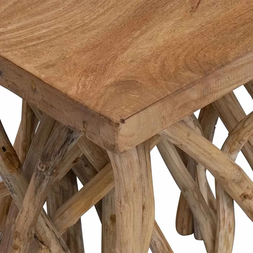 Add a beautiful, nature-inspired look to your home with our wooden coffee table! The log legs embraces with each other, which enhances its rustic feelings. It will surely be a real eye-catcher for every living room! Crafted of solid reclaimed wood tabletop and solid teak wood log legs, this coffee table is durable and stable. The furniture made from reclaimed wood has characteristics of different wood like teak wood, acacia, mango wood, etc. Reclaimed wood is solid, stable, durable and beautiful. The nail holes or clear-faced grains bring their history with them and invite another generation to permeate them with their own. Teak wood is known for its exceptional strength, making it the perfect choice for you to have a long lasting piece of furniture. Important note: Variations in colour and grain may vary from piece to piece, making each of our tables unique. The delivery is random, ensuring the exclusivity and individuality of your product.