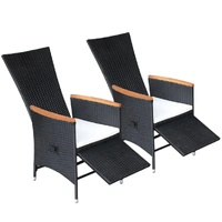 This set of 2 rattan reclining garden chairs has an elegant design and will become the focal point of your garden, patio or balcony. Made of weather-resistant and waterproof PE rattan, these dining chairs are easy to clean, hard-wearing and suitable for daily use. The powder-coated steel frame make the chairs very sturdy and durable. The armrests are made of acacia wood, a tropical hard wood, which is weather resistant. By touching the button on the side, the backrest will recline and the footrest will move up at the same time, for a comfortable lying position. Thanks to their lightweight construction, the chairs are easy to move around. The thick, soft, foam-filled seat cushions are highly comfortable and made of water-repellent polyester. The cushion covers with zips can be easily removed and washed. Delivery includes 2 reclining outdoor dining chairs and 2 seat cushions. Note: We recommend covering the chairs in the rain, snow and frost.