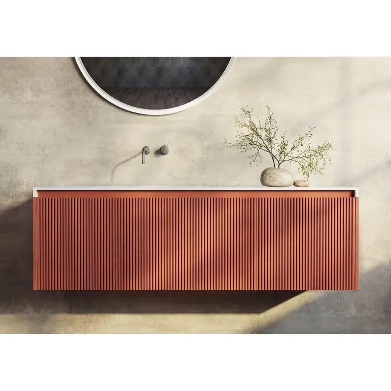 Rimini Vanity in Rainforest colour is a harmonious blend of elegance and functionality. Its unique fluted design adds texture and character to your bathroom's style, while the muted green Rainforest colour exudes an organic and natural charm. Embracing the essence of tranquility, Rimini's Rainforest colour is a muted masterpiece that beckons with its soothing, pastel allure. Enveloping your space in a sense of serenity, it invites you to step into a world where relaxation and luxury intertwine effortlessly. Functionality reigns supreme with abundant storage. Clean lines and a luxurious matte white basin completed with a matching solid surface pop-up waste.