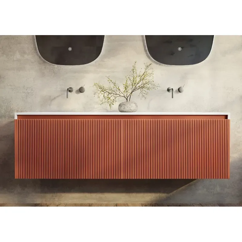 Rimini Vanity in Rainforest colour is a harmonious blend of elegance and functionality. Its unique fluted design adds texture and character to your bathroom's style, while the muted green Rainforest colour exudes an organic and natural charm. Embracing the essence of tranquility, Rimini's Rainforest colour is a muted masterpiece that beckons with its soothing, pastel allure. Enveloping your space in a sense of serenity, it invites you to step into a world where relaxation and luxury intertwine effortlessly. Functionality reigns supreme with abundant storage. Clean lines and a luxurious matte white basin completed with a matching solid surface pop-up waste.