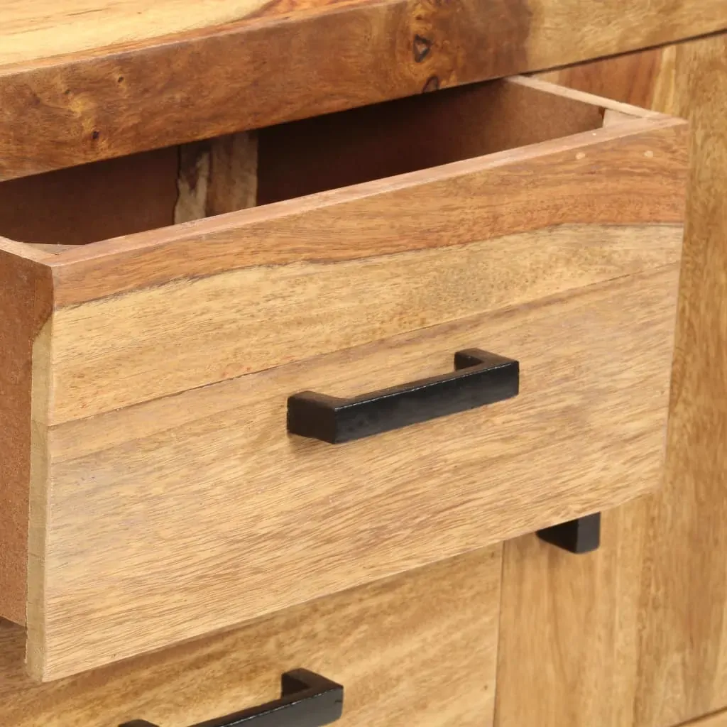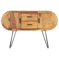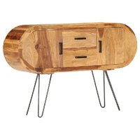 This antique-style round wooden sideboard exudes a vintage charm that will add a stylish touch to your home decor. The sideboard is made of solid acacia wood and powder coated steel, which adds to the stability. acacia is a tropical hardwood that is famous for its rich grains and also known as rosewood or palisander. Every step of the process is carried out with the greatest care, be it polishing, painting or lacquering. The sideboard is fully handmade, and the craftsmanship adds to its spectacular retro style. Because of the 2 doors and 2 drawers, the sideboard offers you large storage space for keeping your items organised. The sideboard is easy to assemble. Important note: The colour may vary from piece to piece, making each of our highboards unique. The delivery is random, ensuring the exclusivity and individuality of your product.