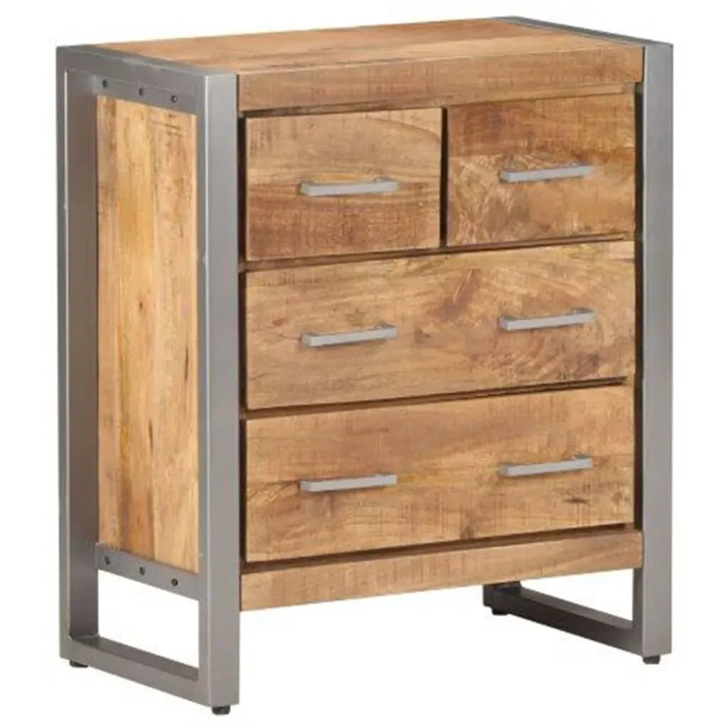 This wooden sideboard adds an industrial style to your living room. The side cabinet is made of rough mango wood, a tropical hardwood with the strength to bear the weight. It also stands the wear and tear of time, making it stable and durable. The iron frame also adds extra stability. This cupboard features four drawers providing ample storage space. Additionally, the sturdy top is ideal for displaying decorative objects such as photo frames, potted plants, vases, etc. Important note: Colours and grains may vary from piece to piece, making each piece unique. The delivery is random, ensuring the exclusivity and individuality of your product.