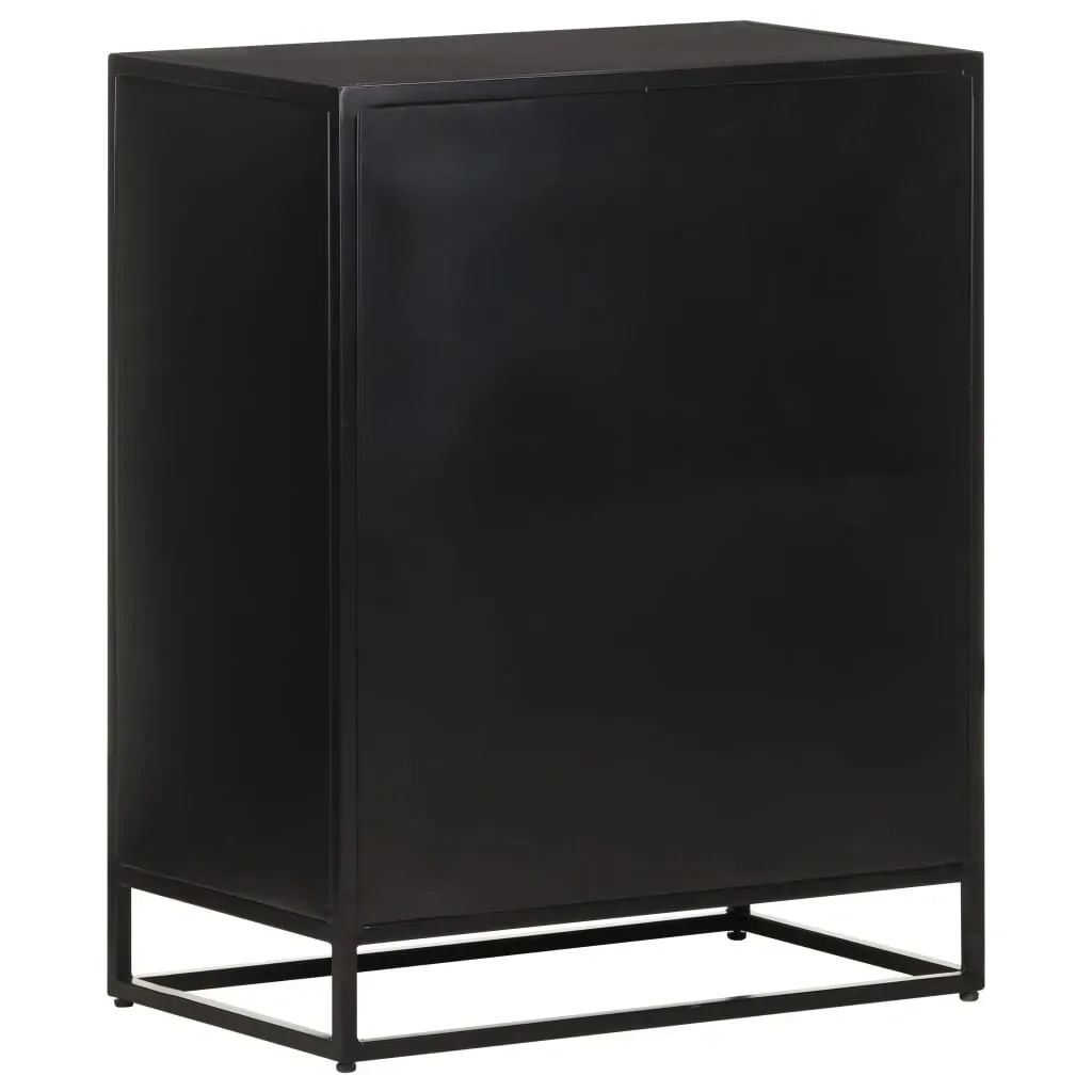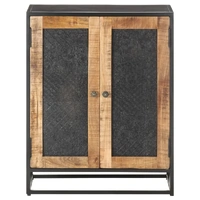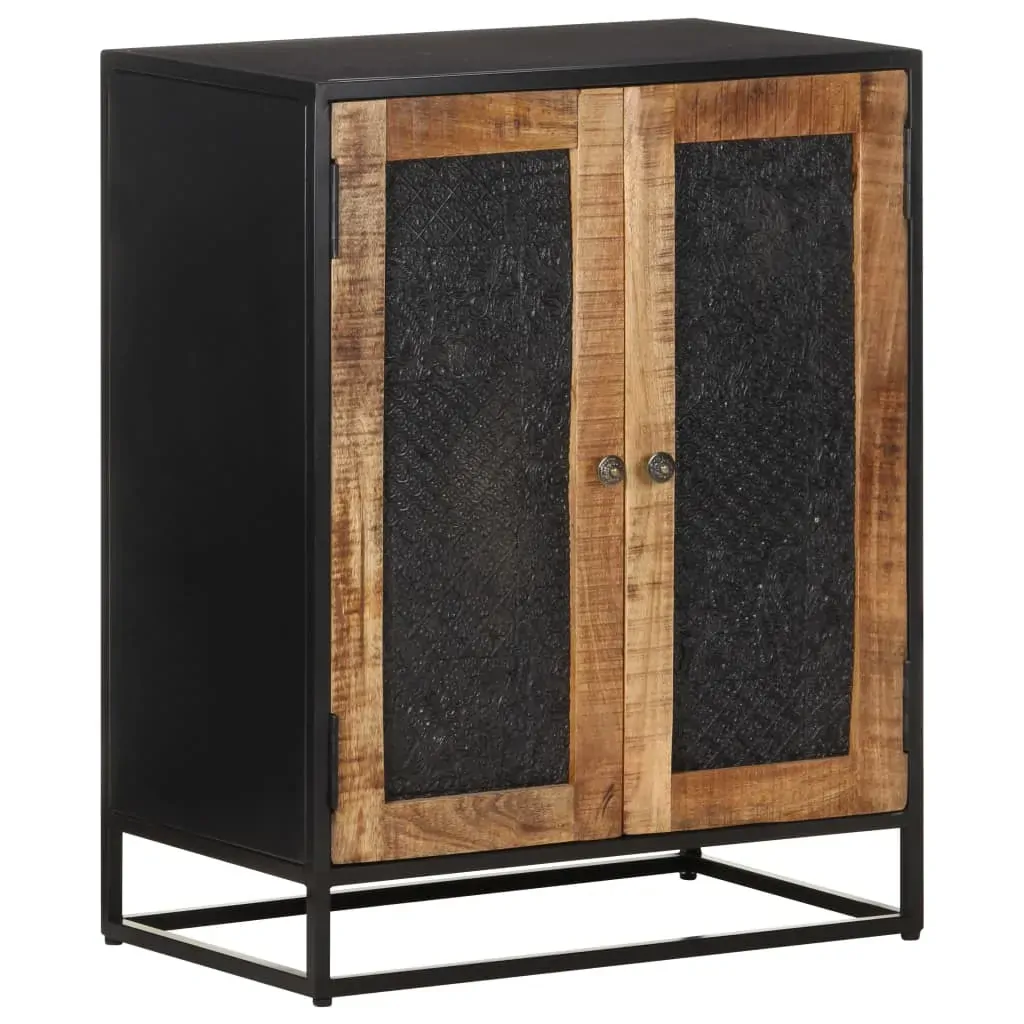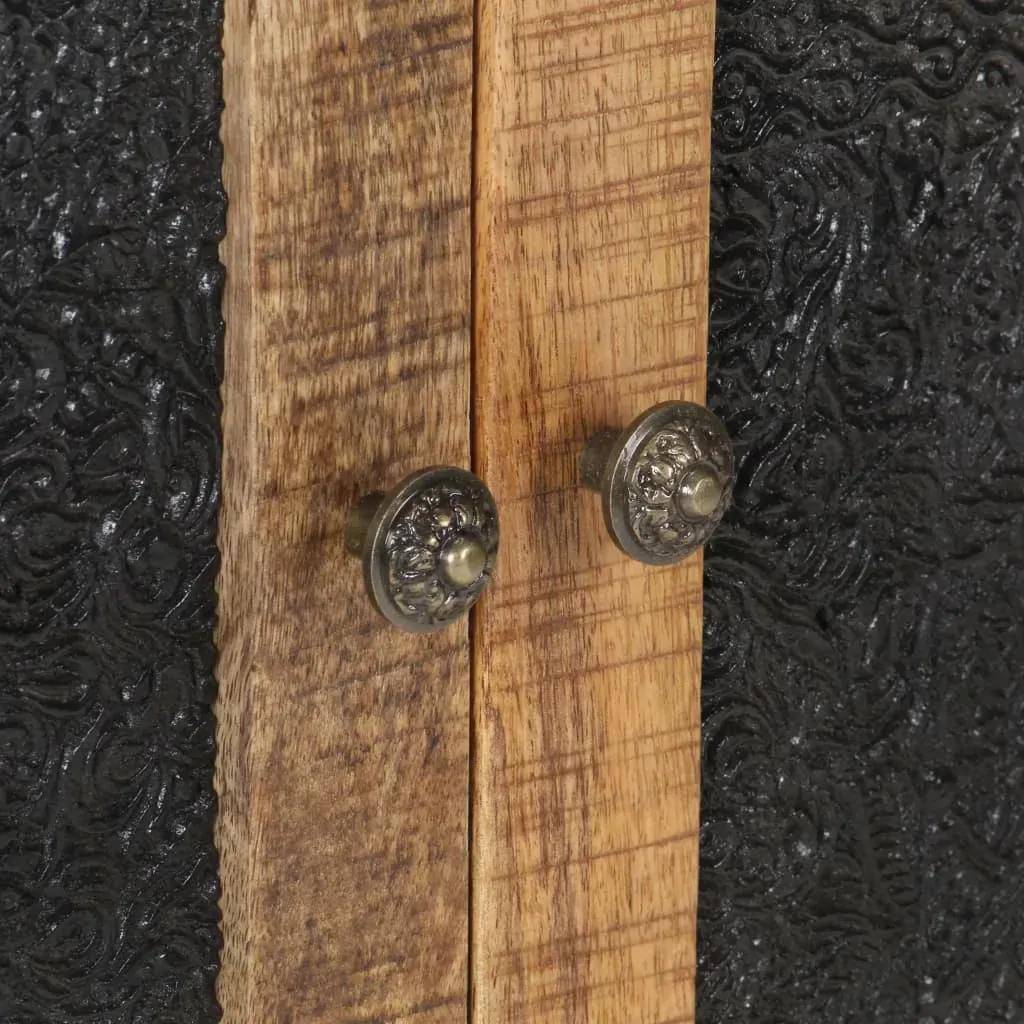 This wooden sideboard adds an industrial style to your living room. The side cabinet is made of rough mango wood, a tropical hardwood with the strength to bear the weight. It also stands the wear and tear of time, making it stable and durable. The powder-coated iron frame also adds extra stability. This cupboard features two doors with hand carved pattern and provides ample storage space. Additionally, the sturdy top is ideal for displaying decorative objects such as photo frames, potted plants, vases, etc. Important note: Colours and grains may vary from piece to piece, making each piece unique. The delivery is random, ensuring the exclusivity and individuality of your product.