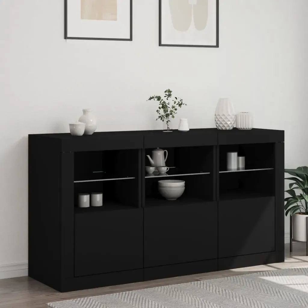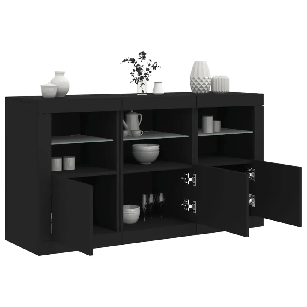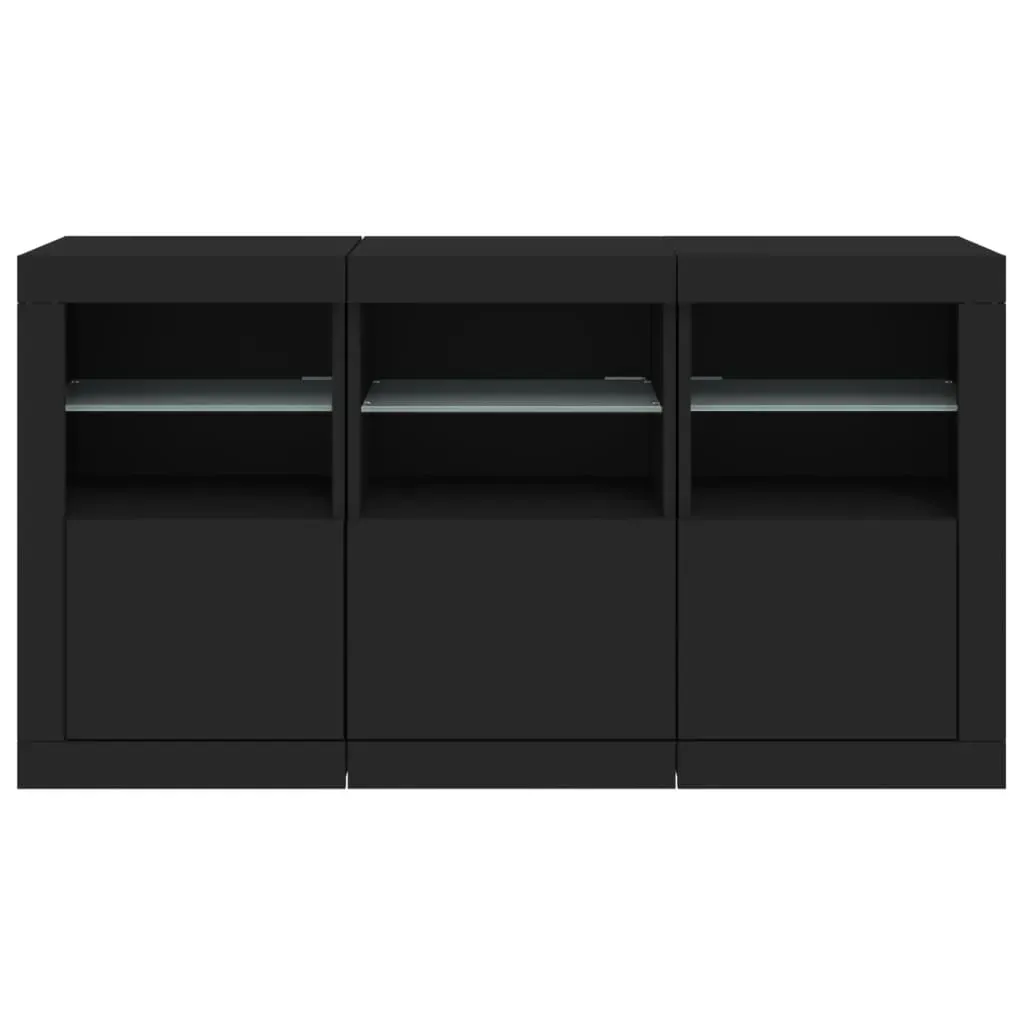 Decorate your room with this modern sideboard with LED lights, it easily blends with furniture in any style at your house. Durable material: The engineered wood is of exceptional quality with smooth surface and also features strength, stability and resistance to moisture.RGB LED lights: The buffet is equipped with vibrant RGB LED lights. With various customisable menus, you can effortlessly change the colour of the lights and even set them to adjust automatically. These LED lights not only enhance the contemporary look of the sideboard cabinet but also add to its trendy appeal.Ample storage space: The storage cabinet offers plenty of space to keep your everyday items neatly arranged and easily accessible.Displaying function: The sturdy top of the hallway cabinet is ideal for displaying decorative objects, photo frames, or potted plants.Practical doors: Keep your essentials free from dust by hiding them behind the doors of the side cabinet. Good to know:The product has a USB connector that requires a certified 5V USB power source (not included). Warning:To prevent it being overturned, this product must be used with the provided wall attachment device.