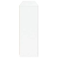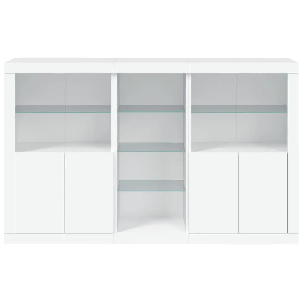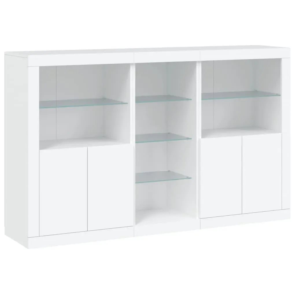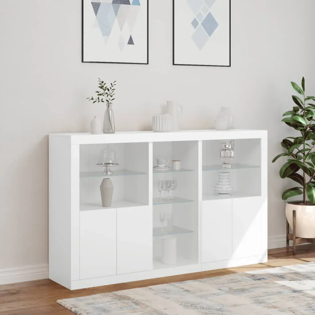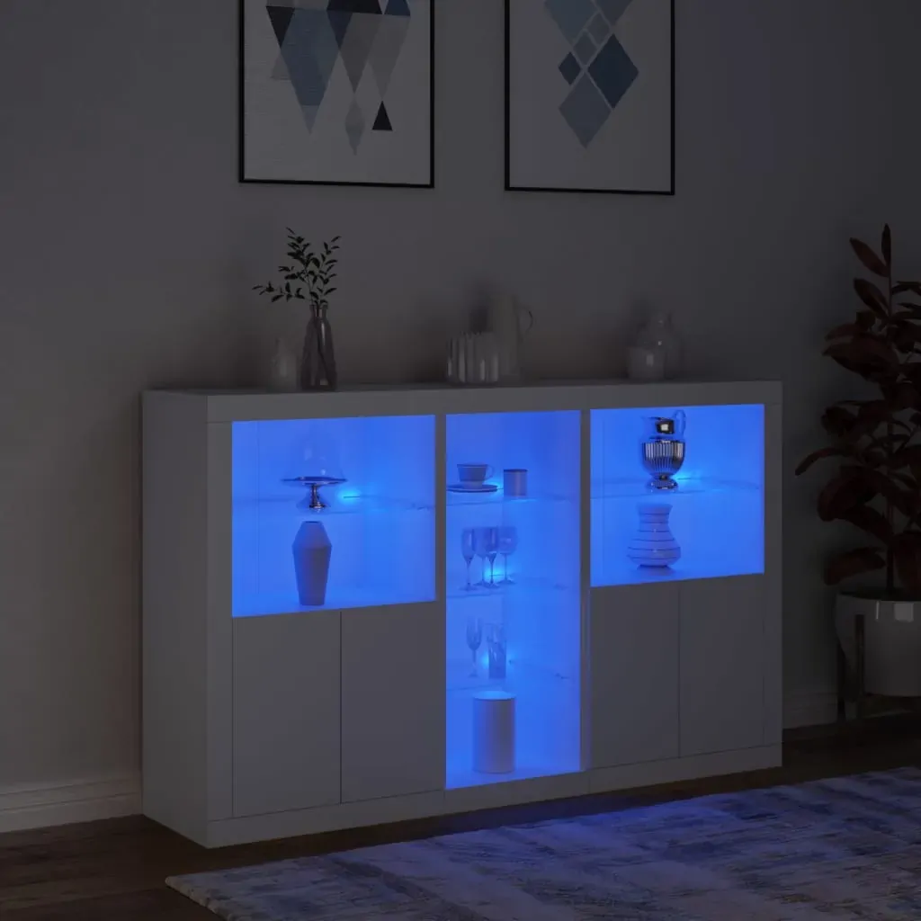 Decorate your room with this modern sideboard with LED lights, it easily blends with furniture in any style at your house. Durable material: The engineered wood is of exceptional quality with smooth surface and also features strength, stability and resistance to moisture.RGB LED lights: The buffet is equipped with vibrant RGB LED lights. With various customisable menus, you can effortlessly change the colour of the lights and even set them to adjust automatically. These LED lights not only enhance the contemporary look of the sideboard cabinet but also add to its trendy appeal.Ample storage space: The storage cabinet offers plenty of space to keep your everyday items neatly arranged and easily accessible.Displaying function: The sturdy top of the hallway cabinet is ideal for displaying decorative objects, photo frames, or potted plants.Practical doors: Keep your essentials free from dust by hiding them behind the doors of the side cabinet. Good to know:The product has a USB connector that requires a certified 5V USB power source (not included). Warning:To prevent it being overturned, this product must be used with the provided wall attachment device.