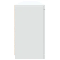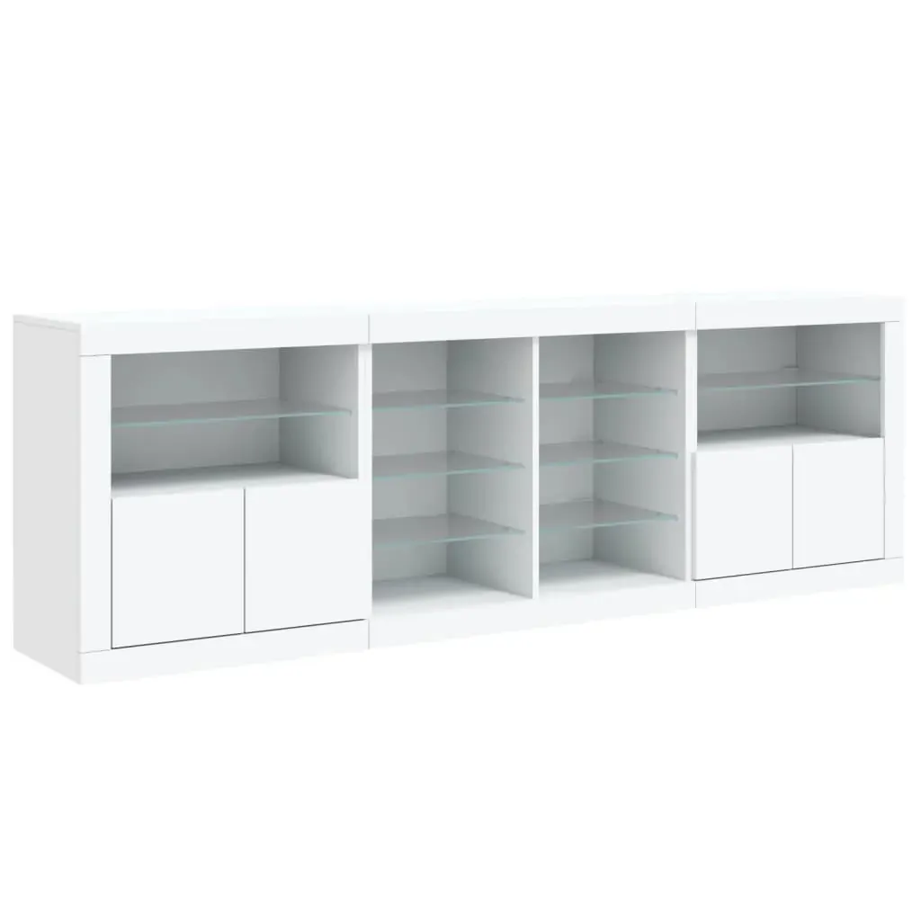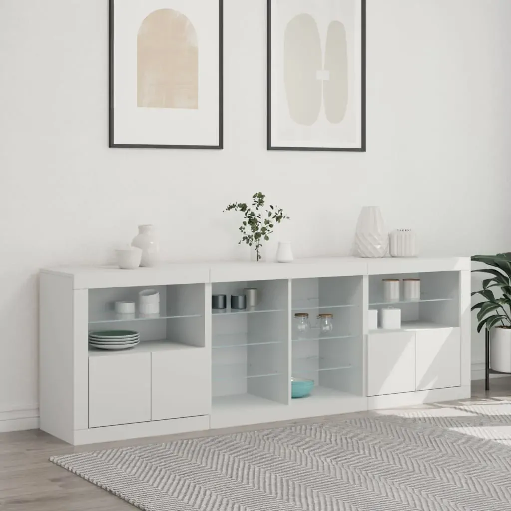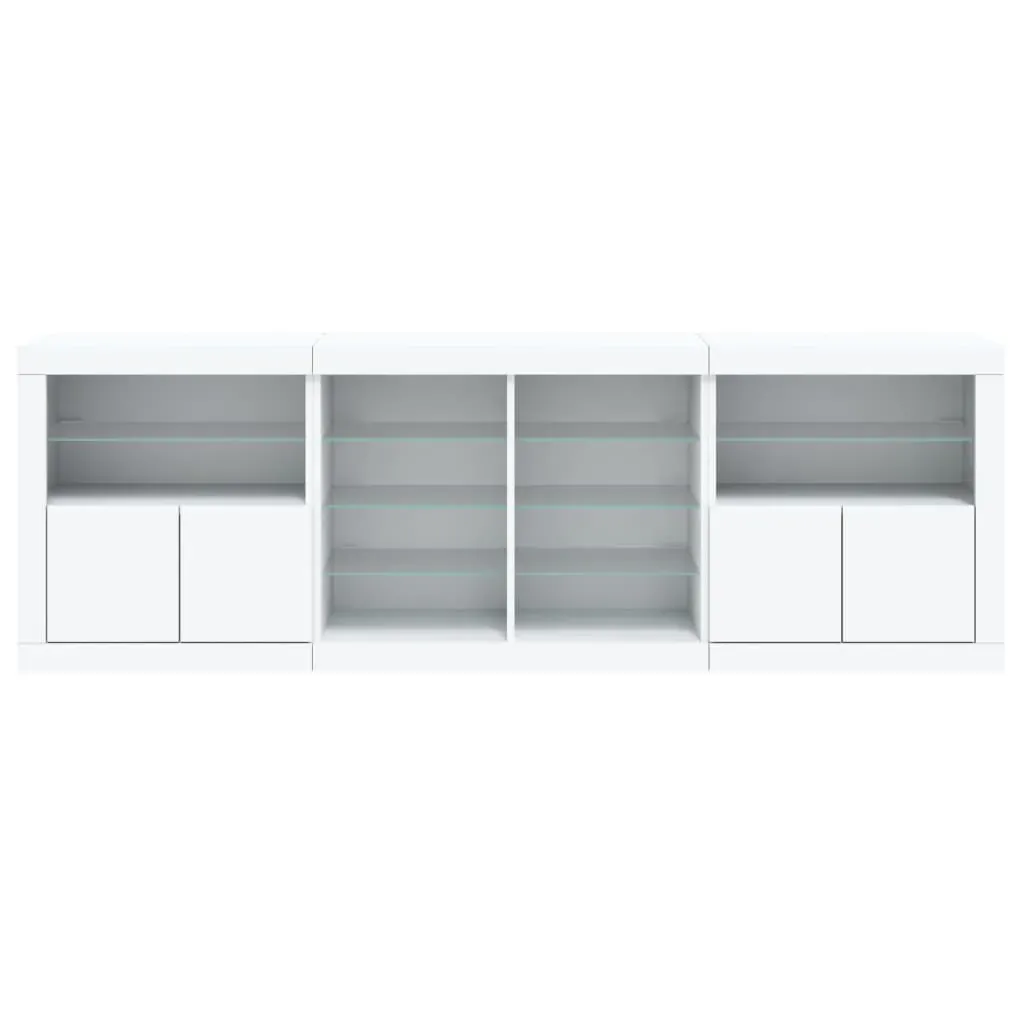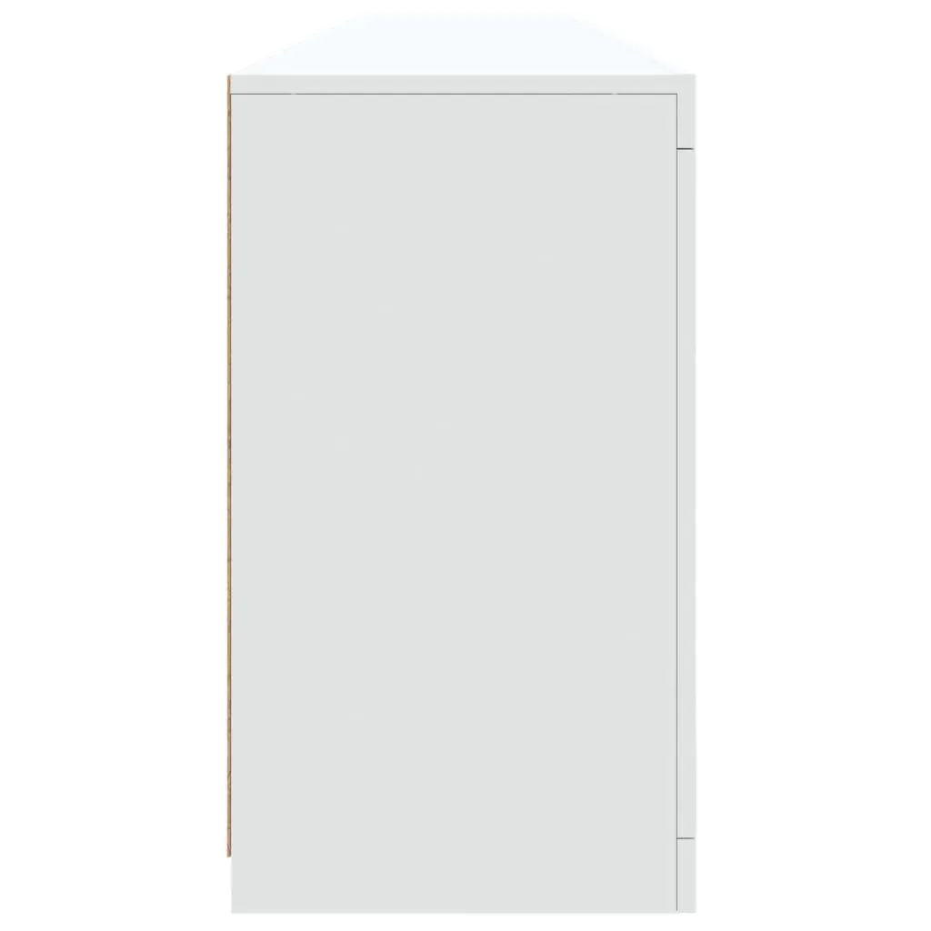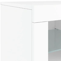 Decorate your room with this modern sideboard with LED lights, it easily blends with furniture in any style at your house. Durable material: The engineered wood is of exceptional quality with smooth surface and also features strength, stability and resistance to moisture.RGB LED lights: The buffet is equipped with vibrant RGB LED lights. With various customisable menus, you can effortlessly change the colour of the lights and even set them to adjust automatically. These LED lights not only enhance the contemporary look of the sideboard cabinet but also add to its trendy appeal.Ample storage space: The storage cabinet offers plenty of space to keep your everyday items neatly arranged and easily accessible.Displaying function: The sturdy top of the hallway cabinet is ideal for displaying decorative objects, photo frames, or potted plants.Practical doors: Keep your essentials free from dust by hiding them behind the doors of the side cabinet. Good to know:The product has a USB connector that requires a certified 5V USB power source (not included). Warning:To prevent it being overturned, this product must be used with the provided wall attachment device.