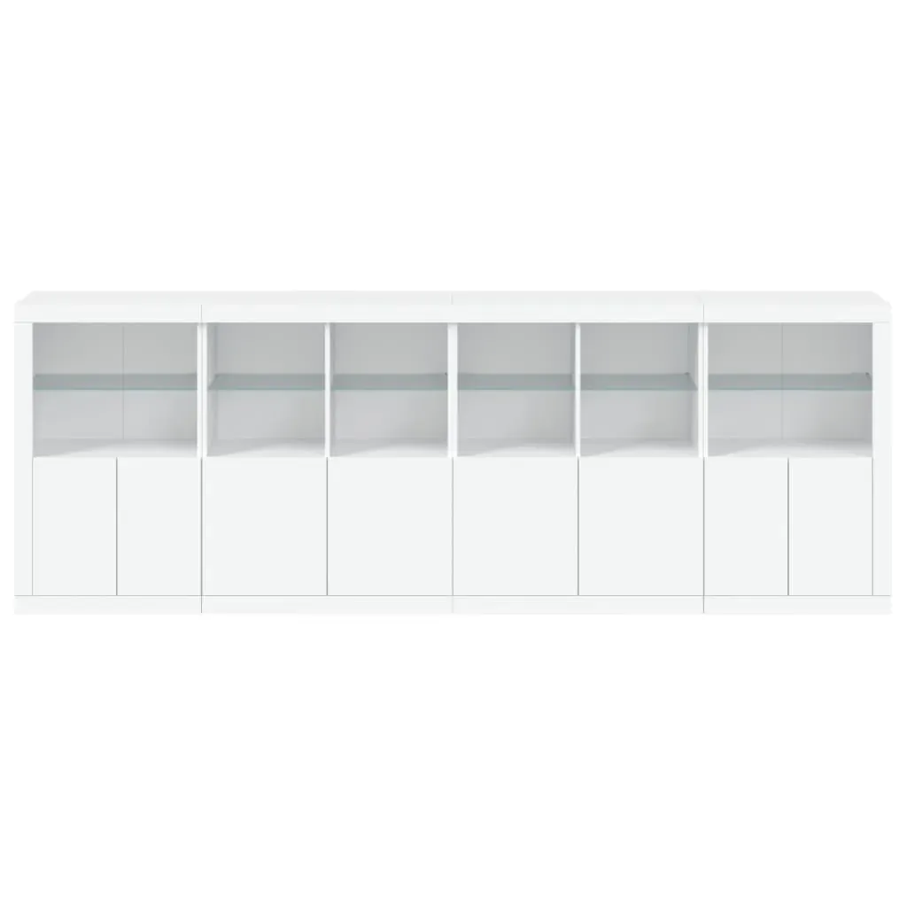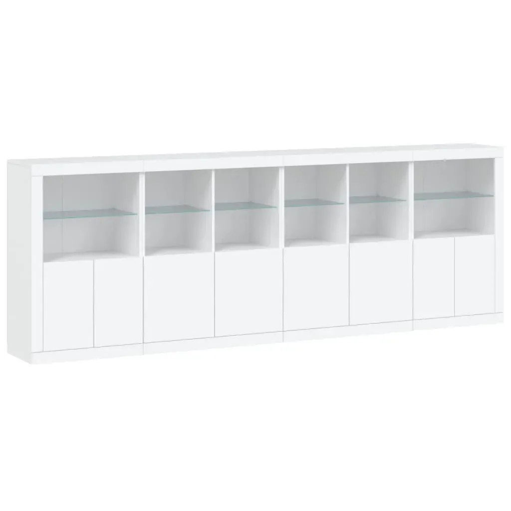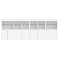 Decorate your room with this modern sideboard with LED lights, it easily blends with furniture in any style at your house. Durable material: The engineered wood is of exceptional quality with smooth surface and also features strength, stability and resistance to moisture.RGB LED lights: The buffet is equipped with vibrant RGB LED lights. With various customisable menus, you can effortlessly change the colour of the lights and even set them to adjust automatically. These LED lights not only enhance the contemporary look of the sideboard cabinet but also add to its trendy appeal.Ample storage space: The storage cabinet offers plenty of space to keep your everyday items neatly arranged and easily accessible.Displaying function: The sturdy top of the hallway cabinet is ideal for displaying decorative objects, photo frames, or potted plants.Practical doors: Keep your essentials free from dust by hiding them behind the doors of the side cabinet. Good to know:The product has a USB connector that requires a certified 5V USB power source (not included). Warning:To prevent it being overturned, this product must be used with the provided wall attachment device.